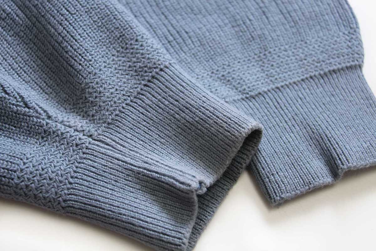 ミリタリーの5ボタンセーターをモチーフに作られており、編み変えなども施された手の込んだお品です。