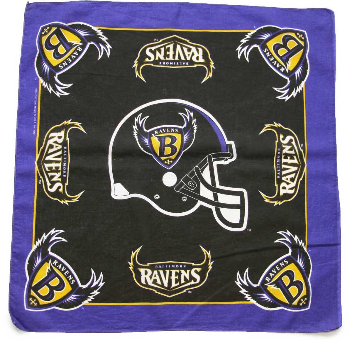 90s USA製 NFL BALTIMORE RAVENS アメフト ロゴ コットン バンダナ 黒×青紫