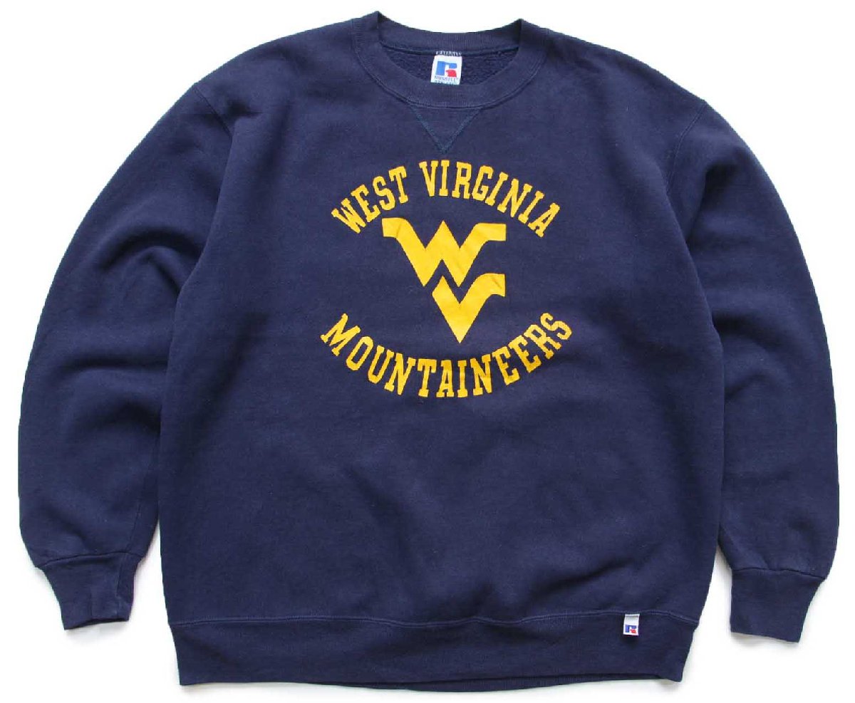90s USA製 RUSSELLラッセル WEST VIRGINIA MOUNTAINEERS ペンキ飛び 前V スウェット 紺 L