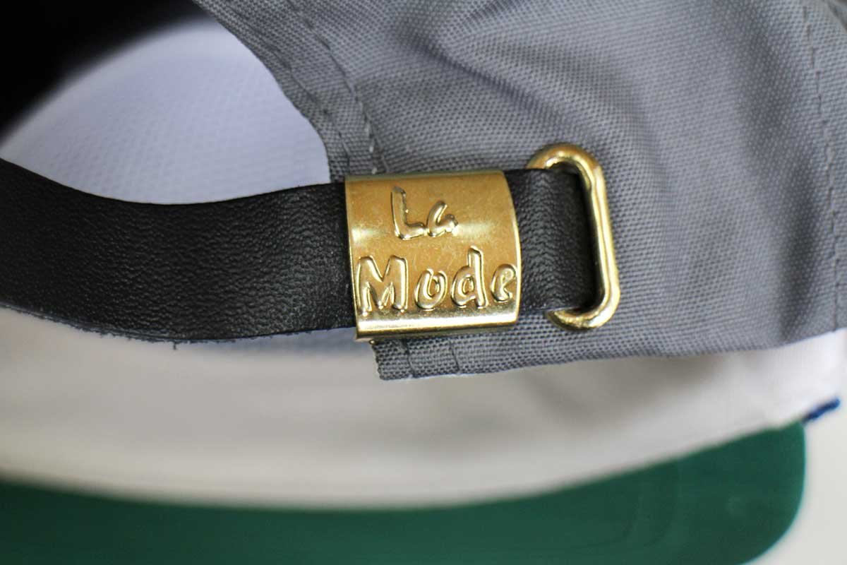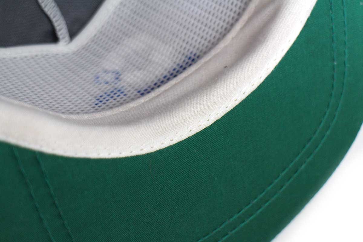 サイドとバックパネルにハトメあり、フロント内装に型崩れ防止の為のメッシュあり、フロントに刺繍が施されています。