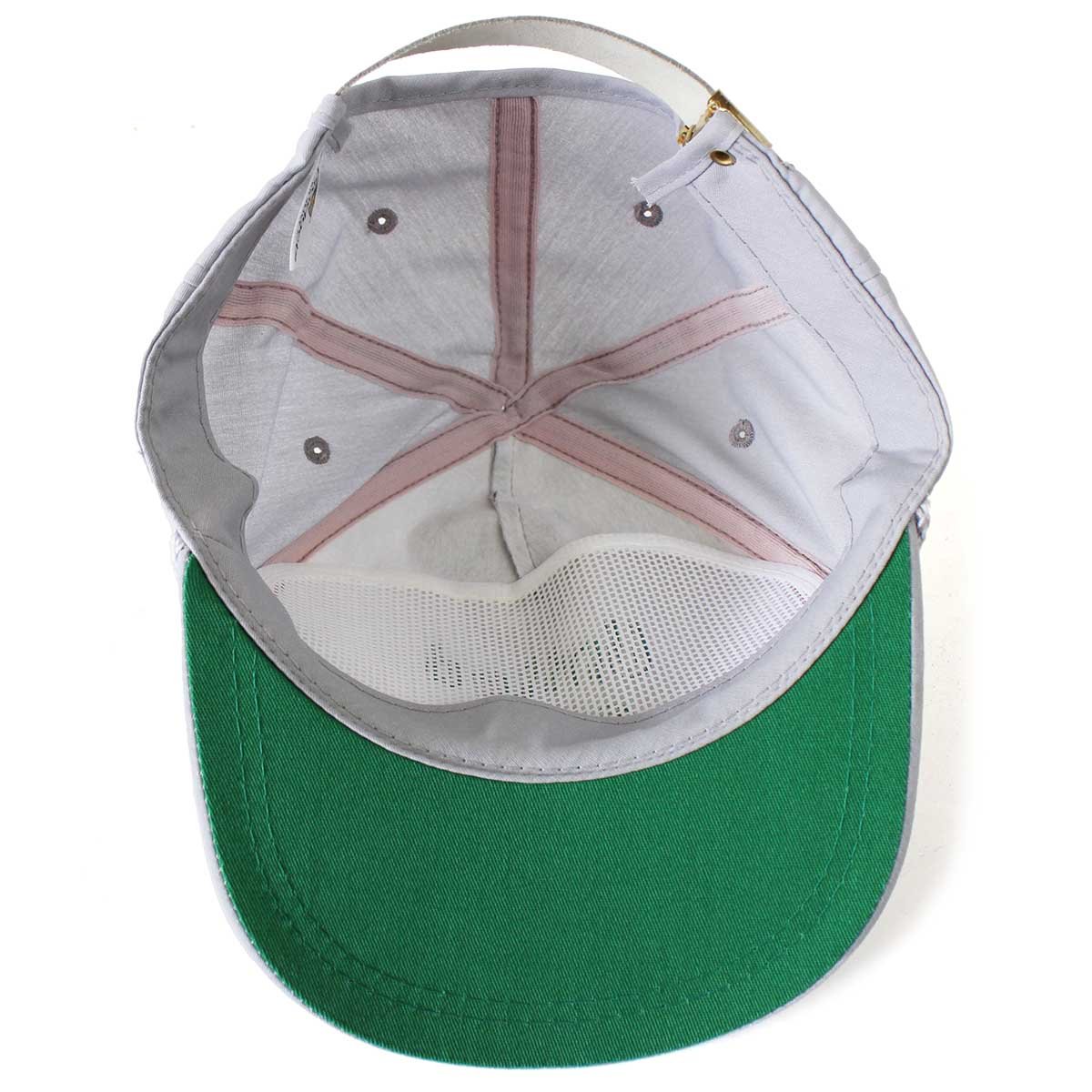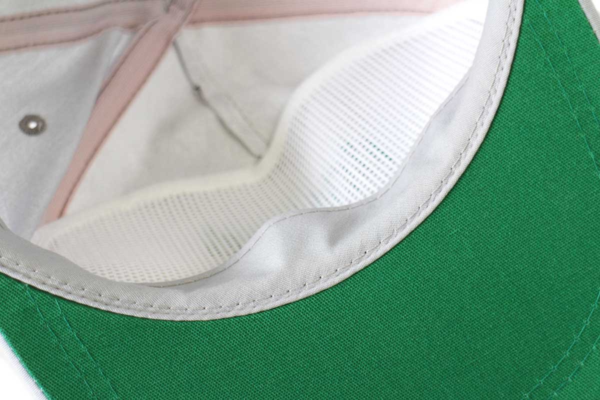 サイドとバックパネルにハトメあり、フロント内装に型崩れ防止の為のメッシュあり、フロントに刺繍が施されています。