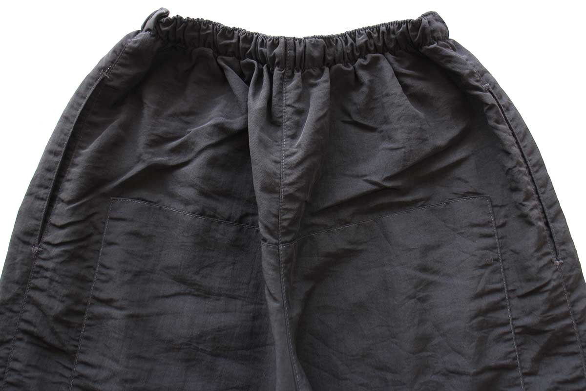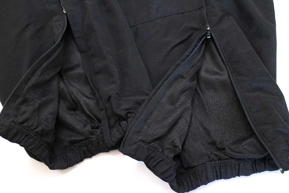 ウエストにゴム&ドローコードあり、サイドポケットあり、裾にジップあり、右ポケット内にネームタグあり、裏地はメッシュ、ヒザとヒップは生地が二重になっています。