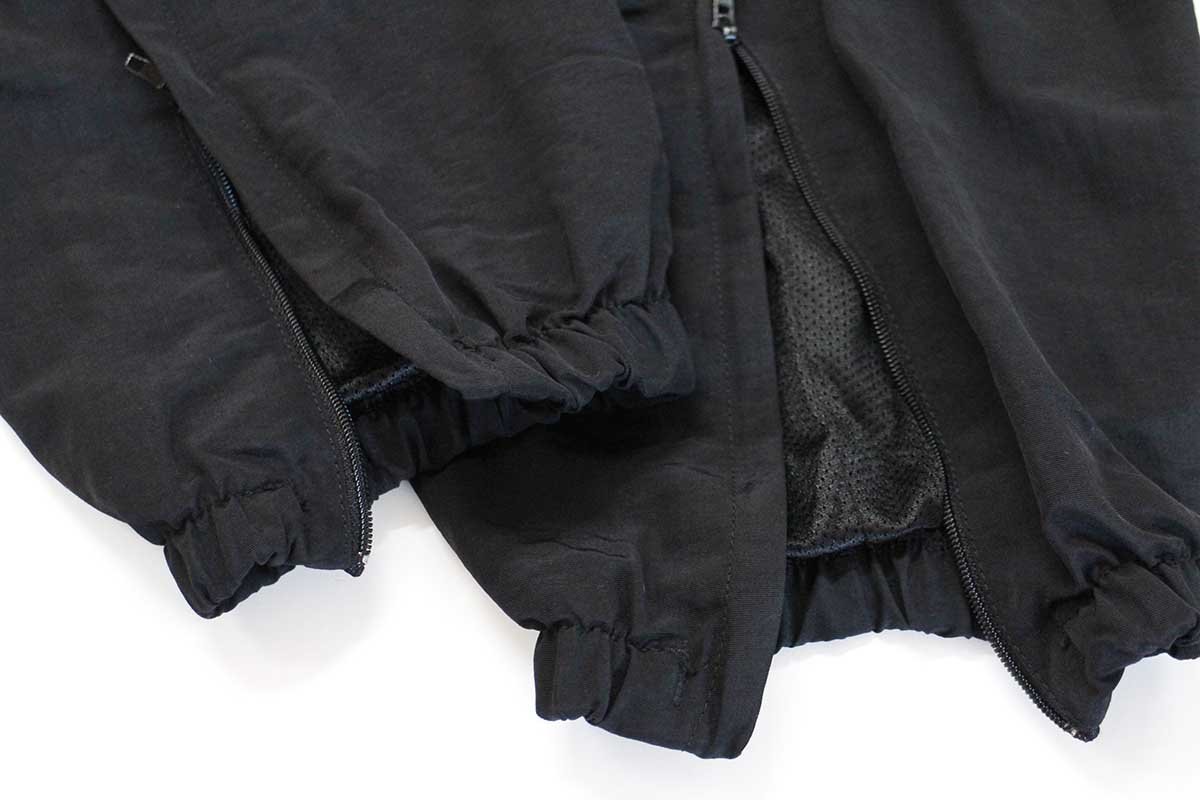 ウエストにゴム&ドローコードあり、サイドポケットあり、裾にジップあり、右ポケット内にネームタグあり、裏地はメッシュ、ヒザとヒップは生地が二重になっています。