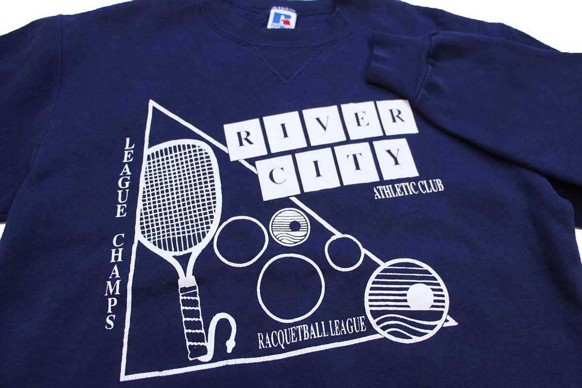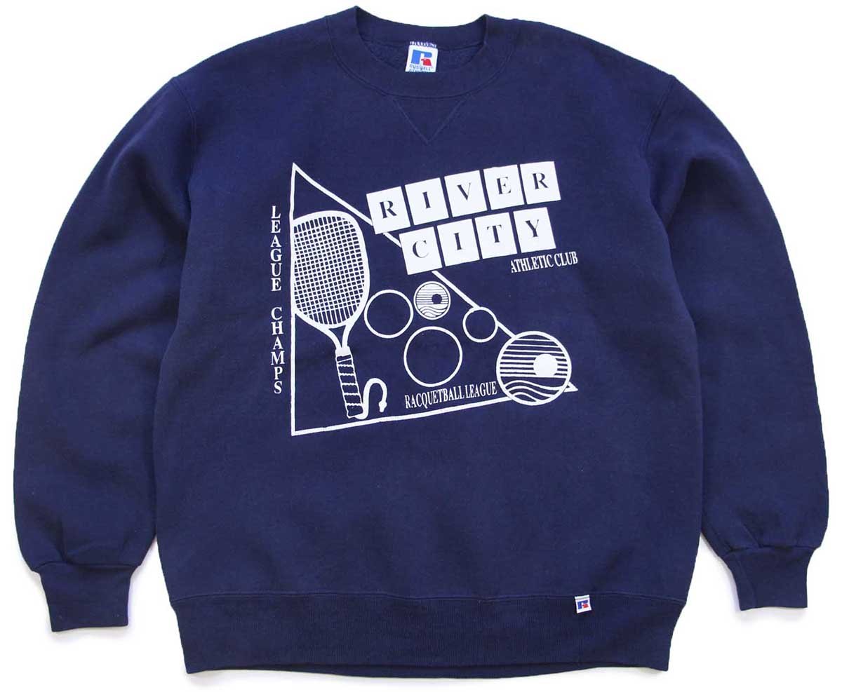90s USA製 RUSSELLラッセル RACQUETBALL LEAGUE ラケット ひび割れプリント 前V スウェット 紺 L