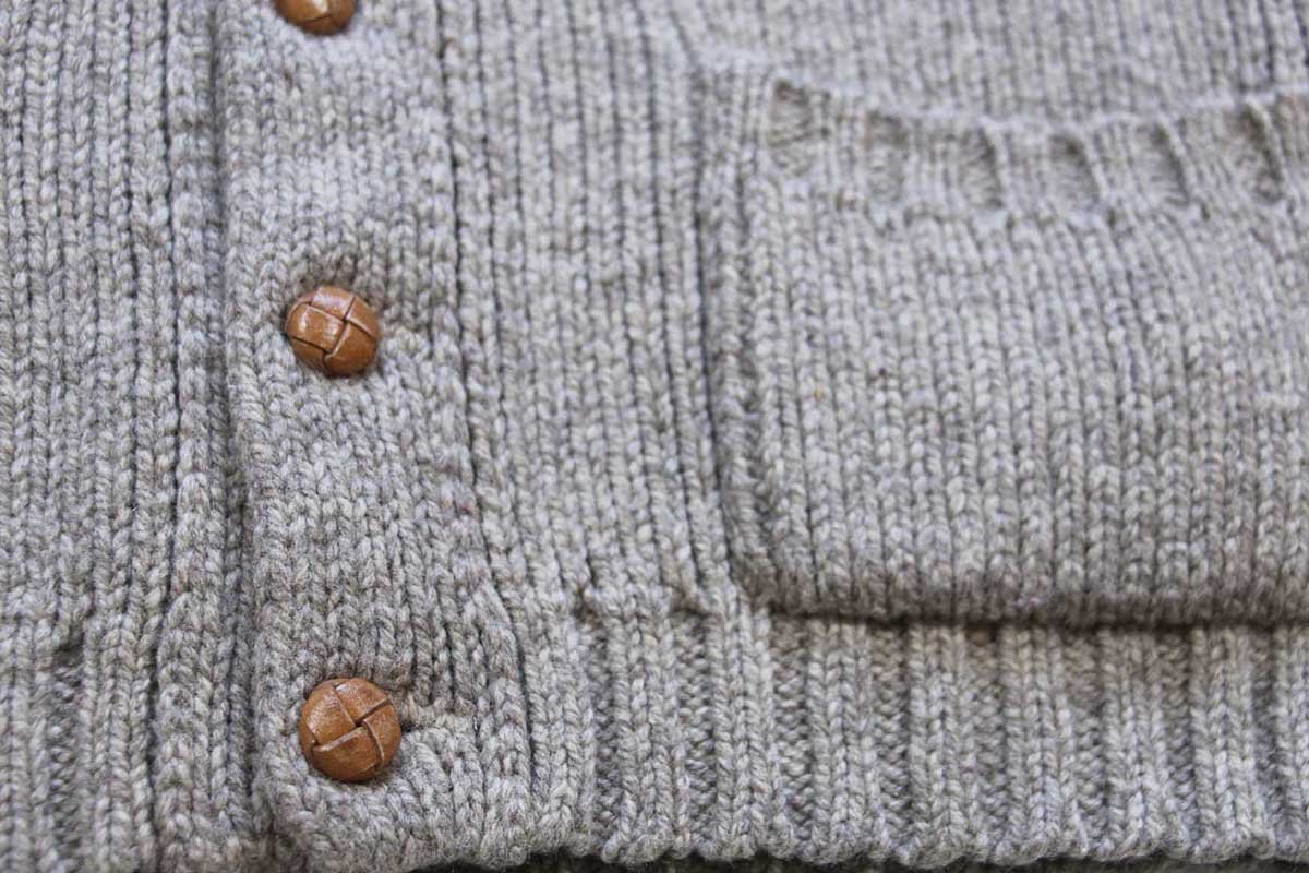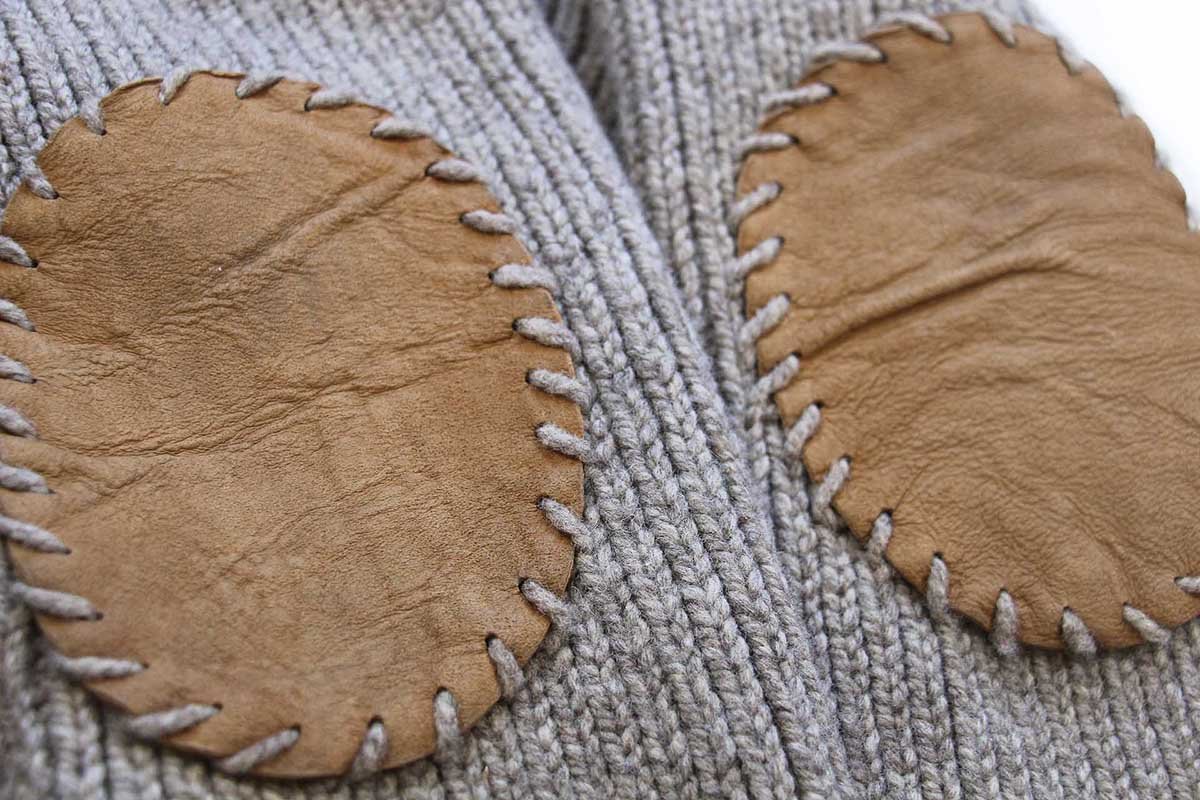 ラグランスリーブ、くるみボタン、おそらくシープスキンのエルボーパッチ付き