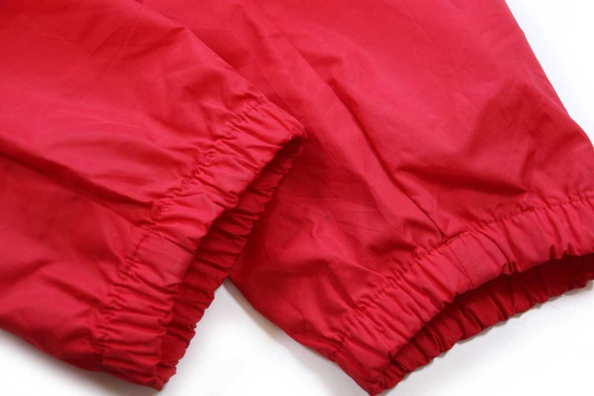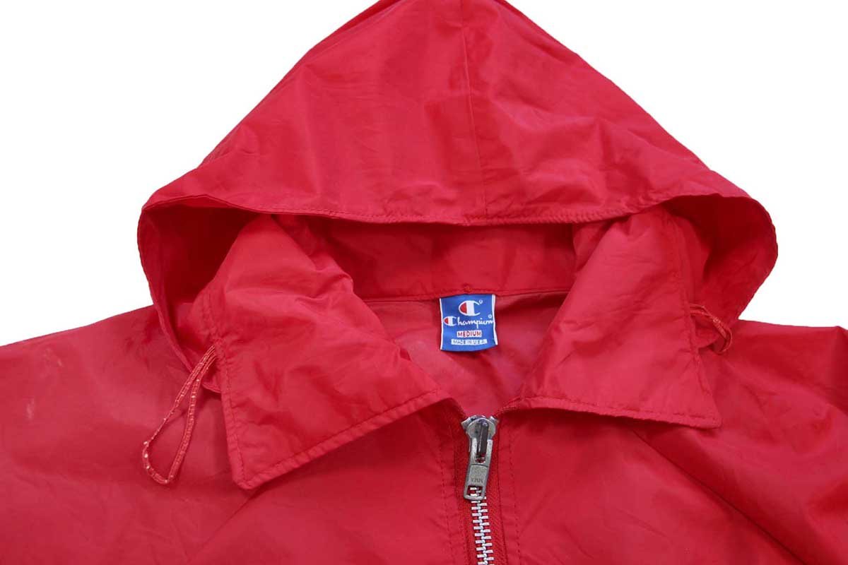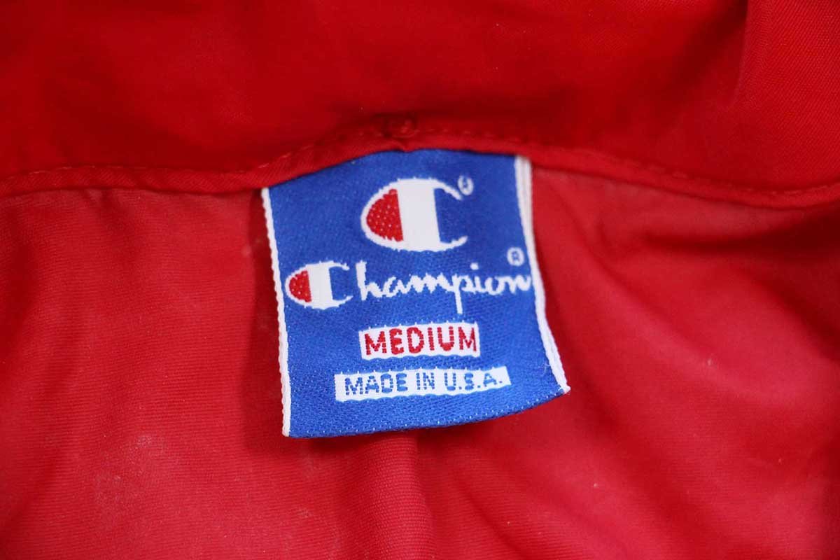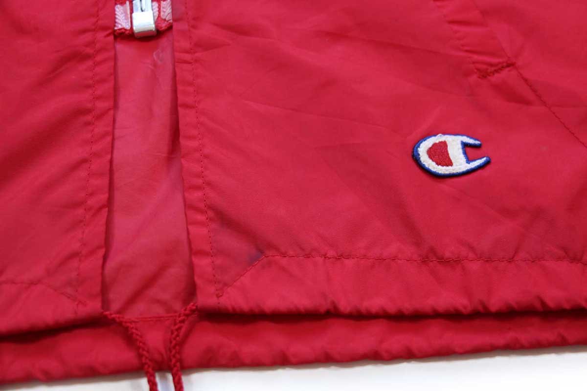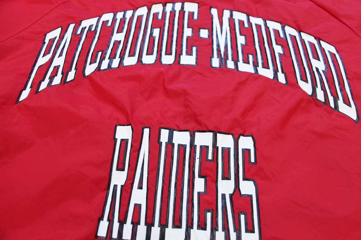 90s USA製 Championチャンピオン PATCHOGUE-MEDFORD 12 RAIDERS 両面プリント ナイロンジャケット 赤