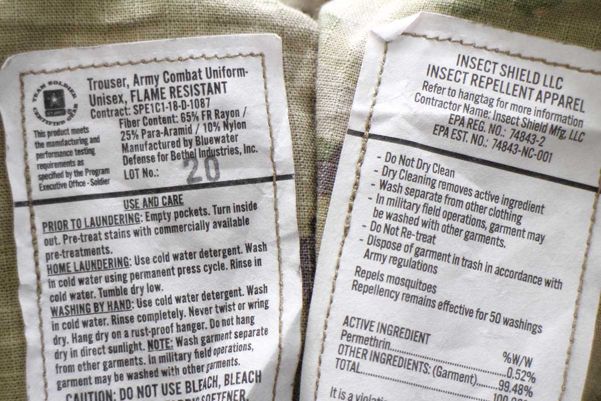 フロントボタンフライ、縫製はダブルステッチ、裾にドローコードあり、防虫性(INSECT REPELLENT APPAREL)表記あり、ヒザとヒップは生地が二重になっています。