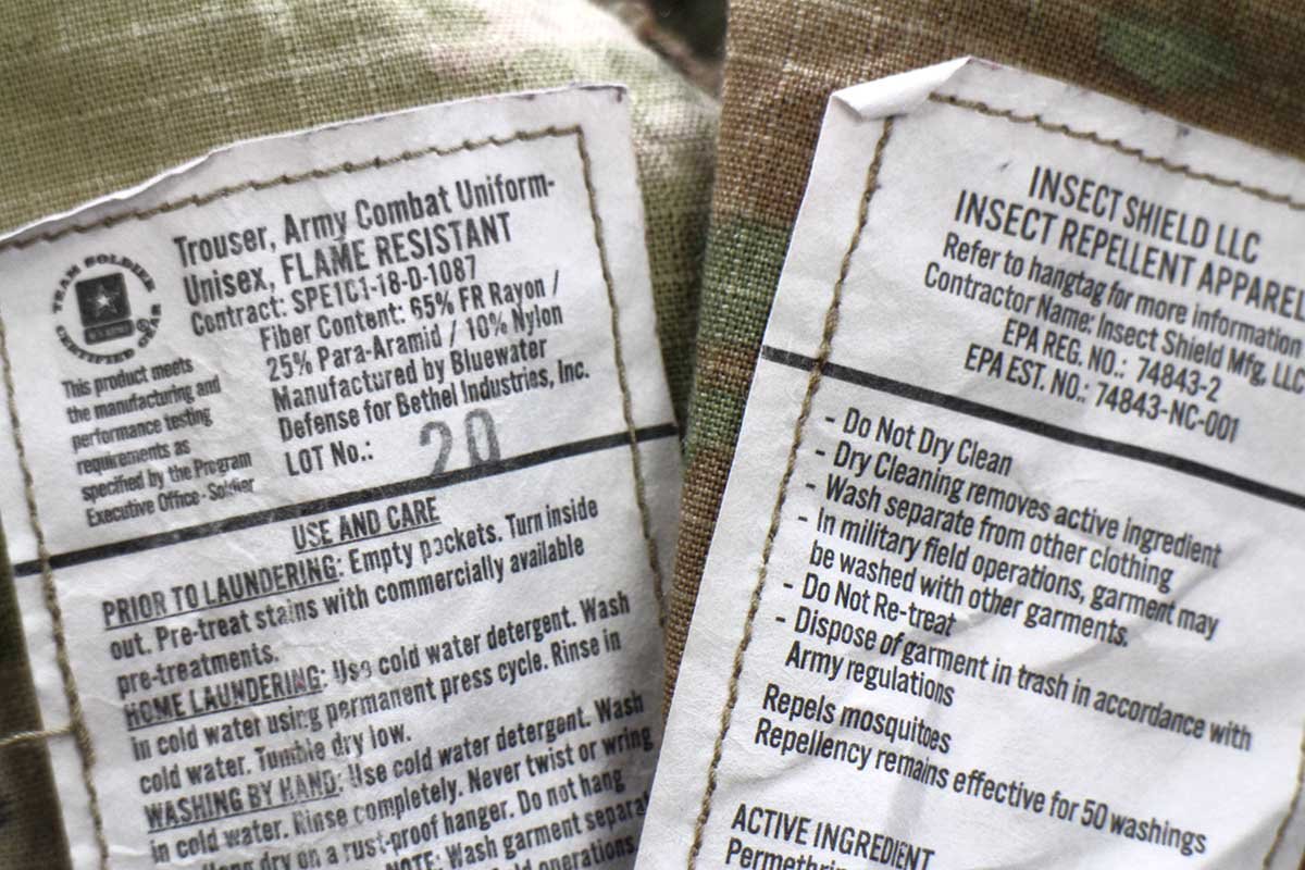 フロントボタンフライ、縫製はダブルステッチ、裾にドローコードあり、防虫性(INSECT REPELLENT APPAREL)表記あり、ヒザとヒップは生地が二重になっています。