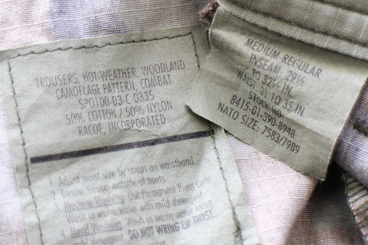 2003年 U.S.ARMY【TROUSERS, HOT WEATHER, WOODLAND CAMOUFLAGE PATTERN; COMBAT】カーゴパンツです。