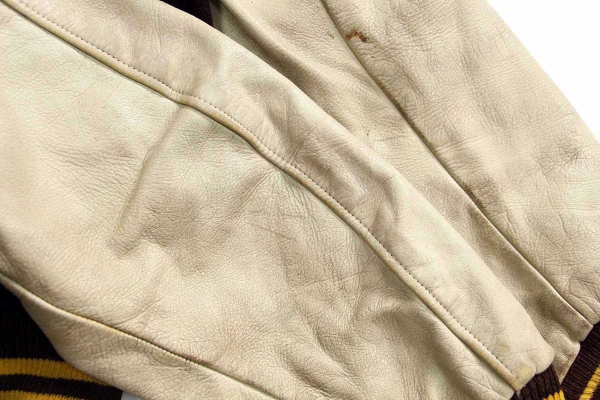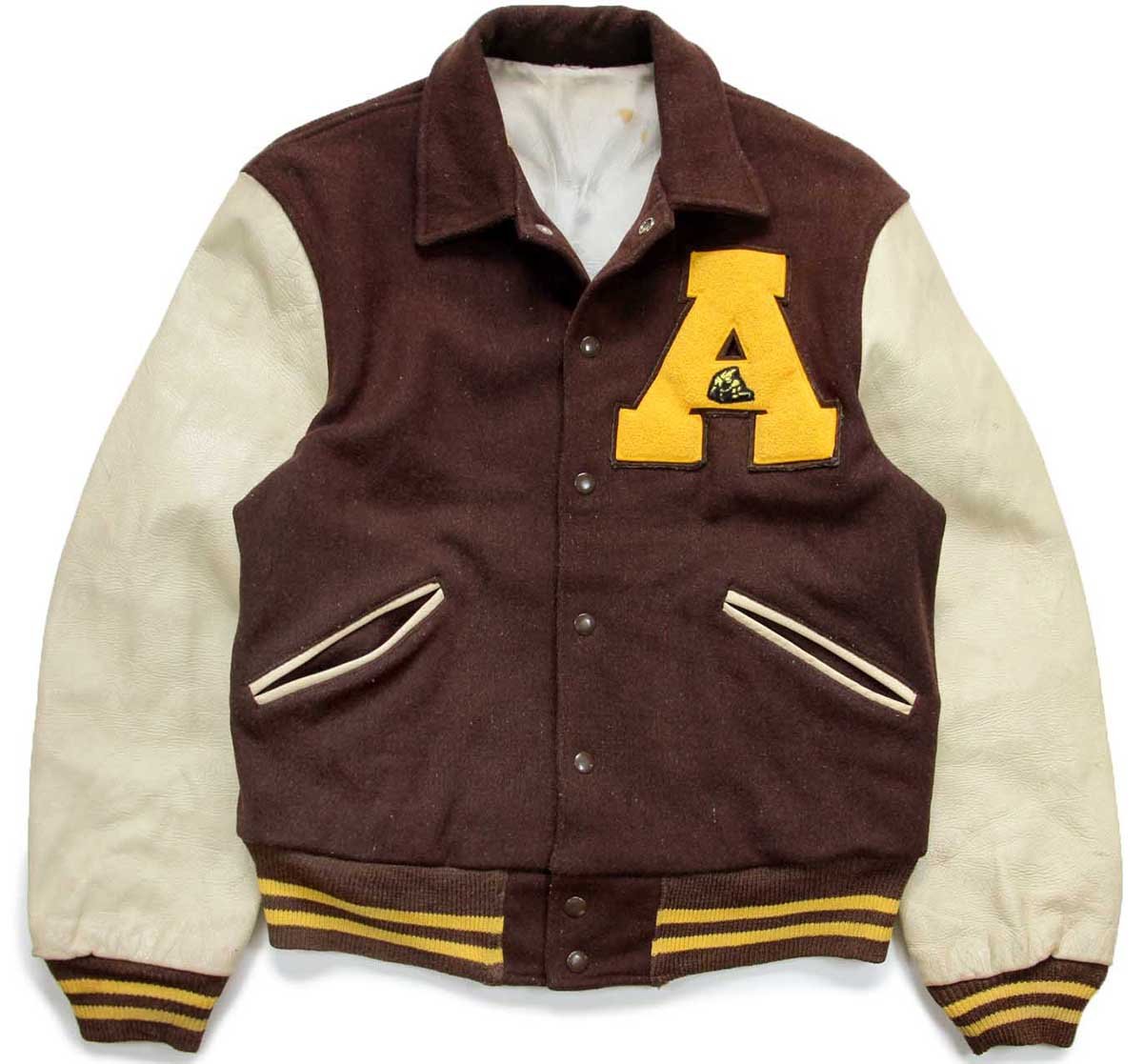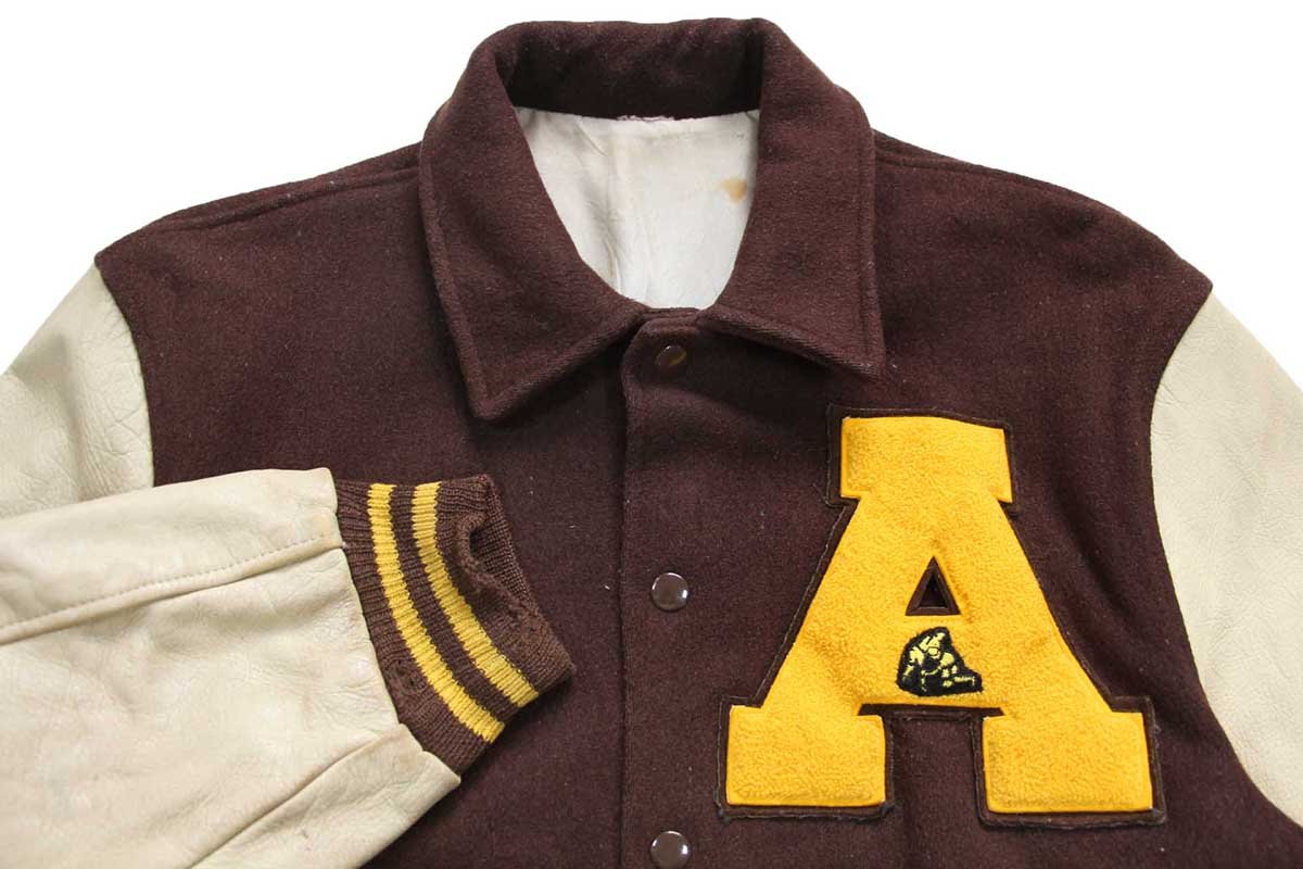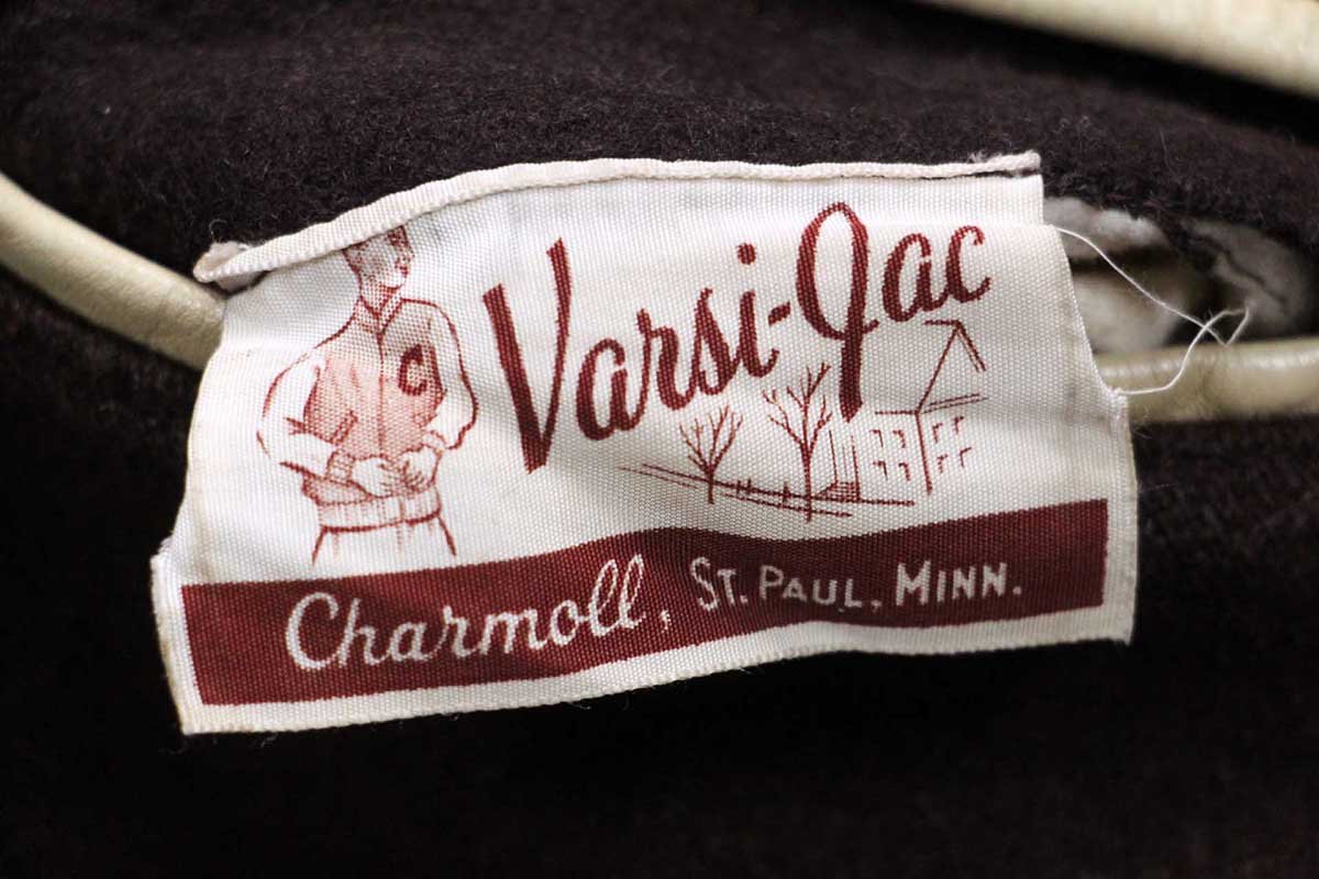 60s Varsi-Jac レタードパッチ付き メルトン ウール 袖革スタジャン 焦げ茶×アイボリー