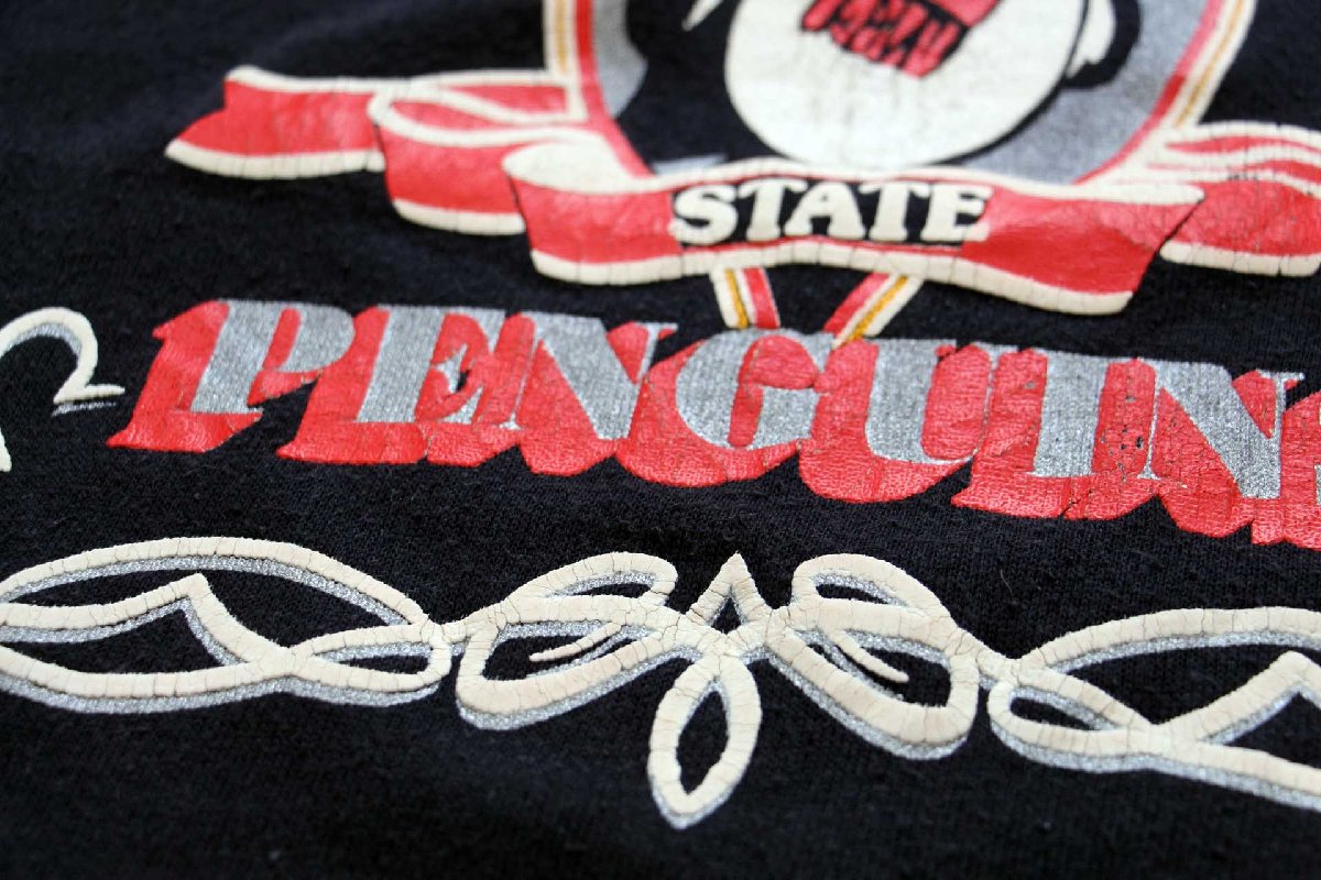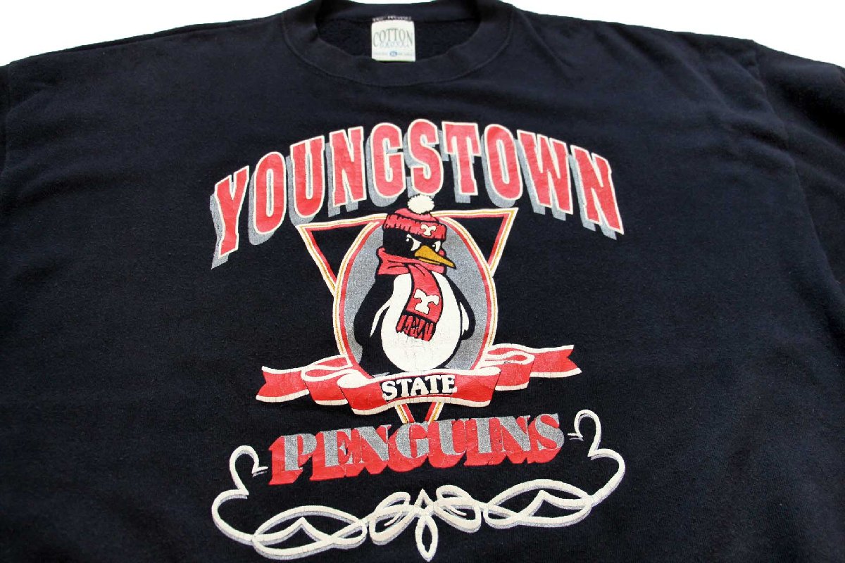 90s USA製 YOUNGSTOWN PENGUINS マスコット ひび割れプリント スウェット 黒 XL