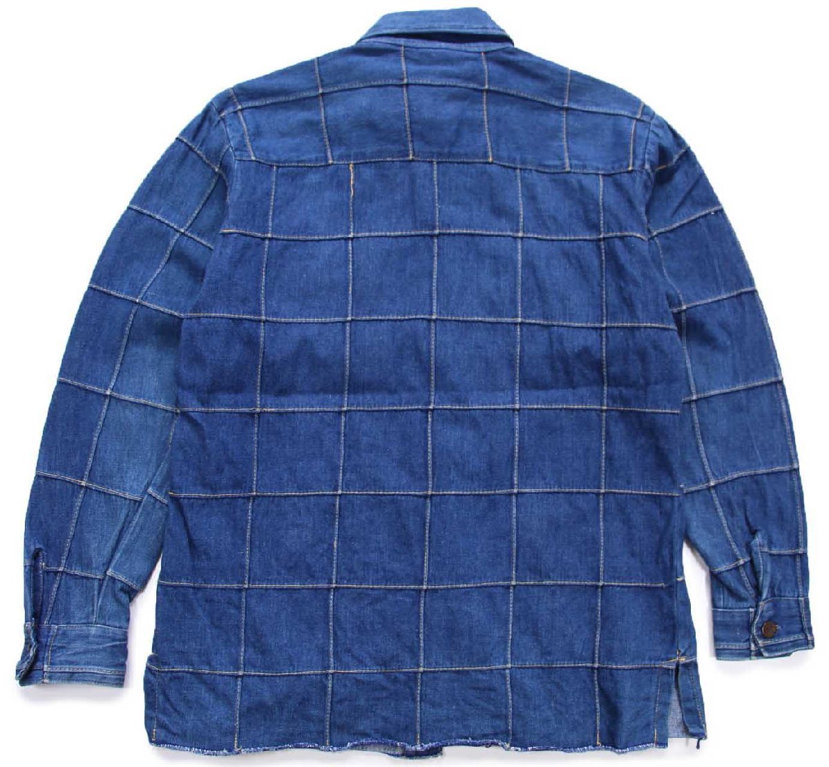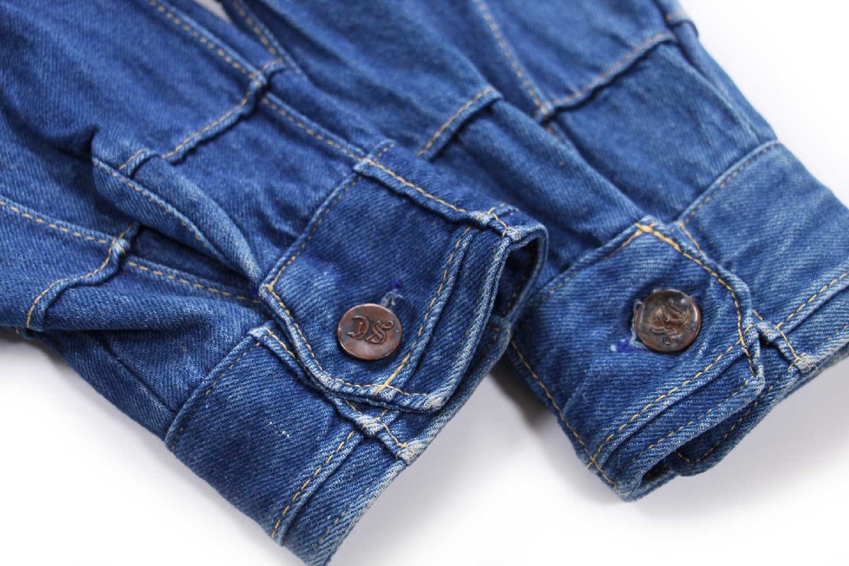 コンディション:着用感があり、襟と袖に若干の色落ちと薄汚れ、フロント裾に少しのステッチ抜け、左袖ボタンに凹みがあります。目立つダメージや酷い汚れはなく、生地もしっかりしていて、古着慣れされている方なら問題なく着用いただける程度です。