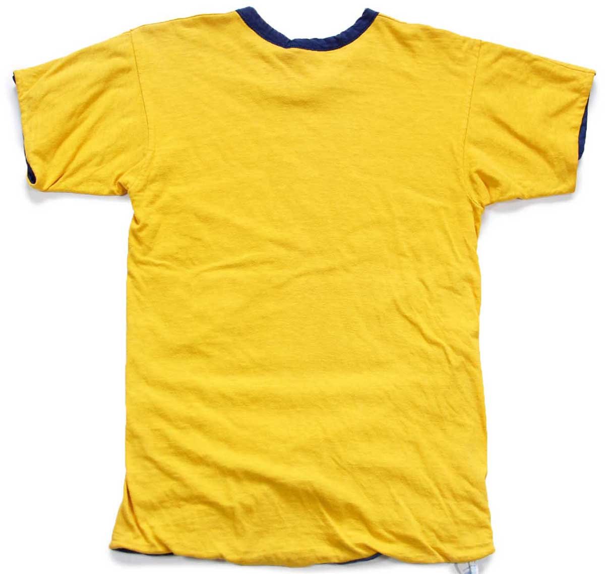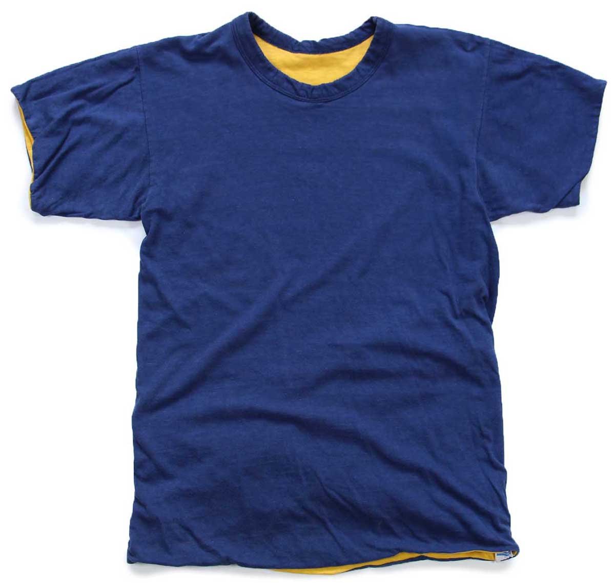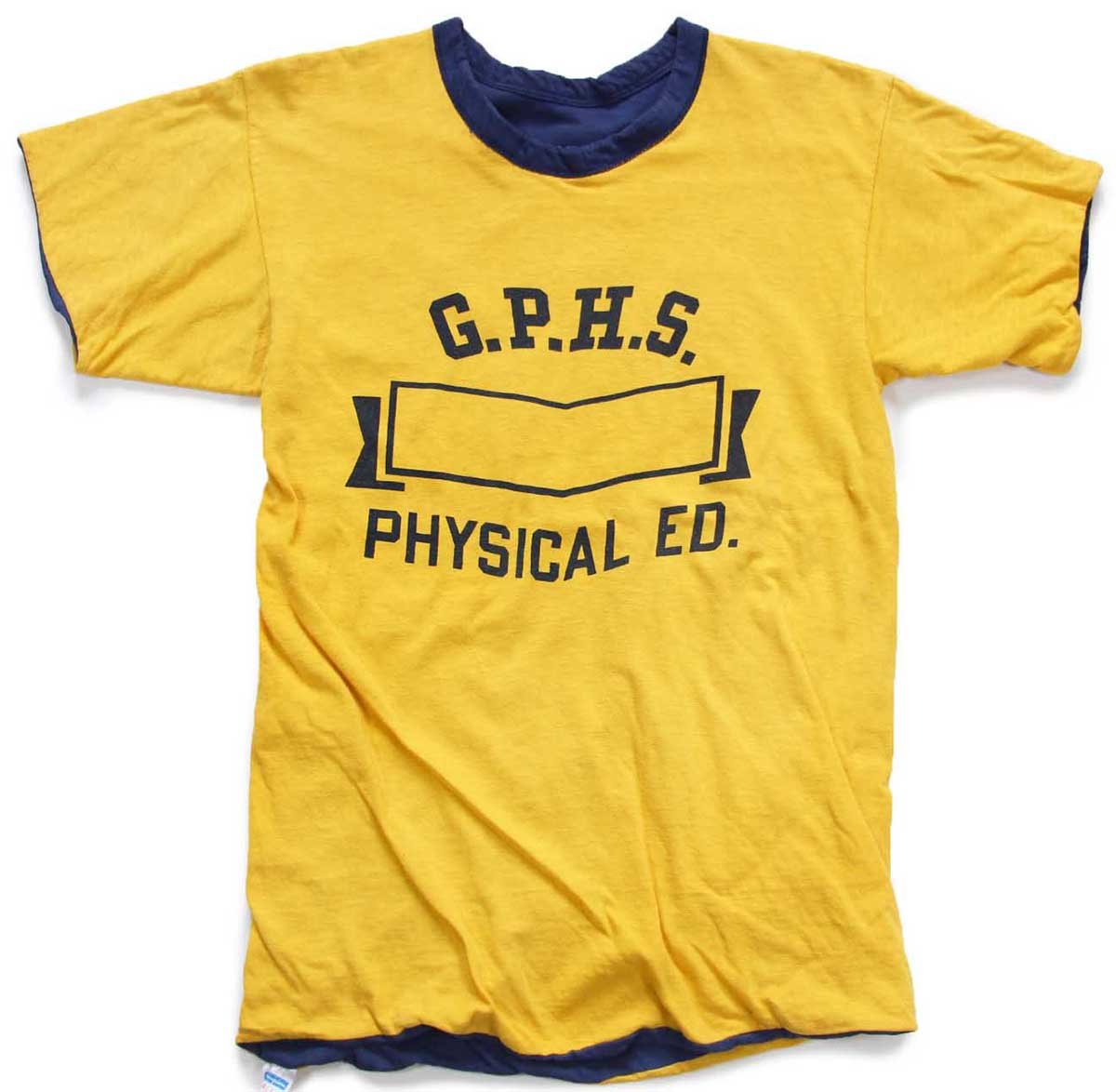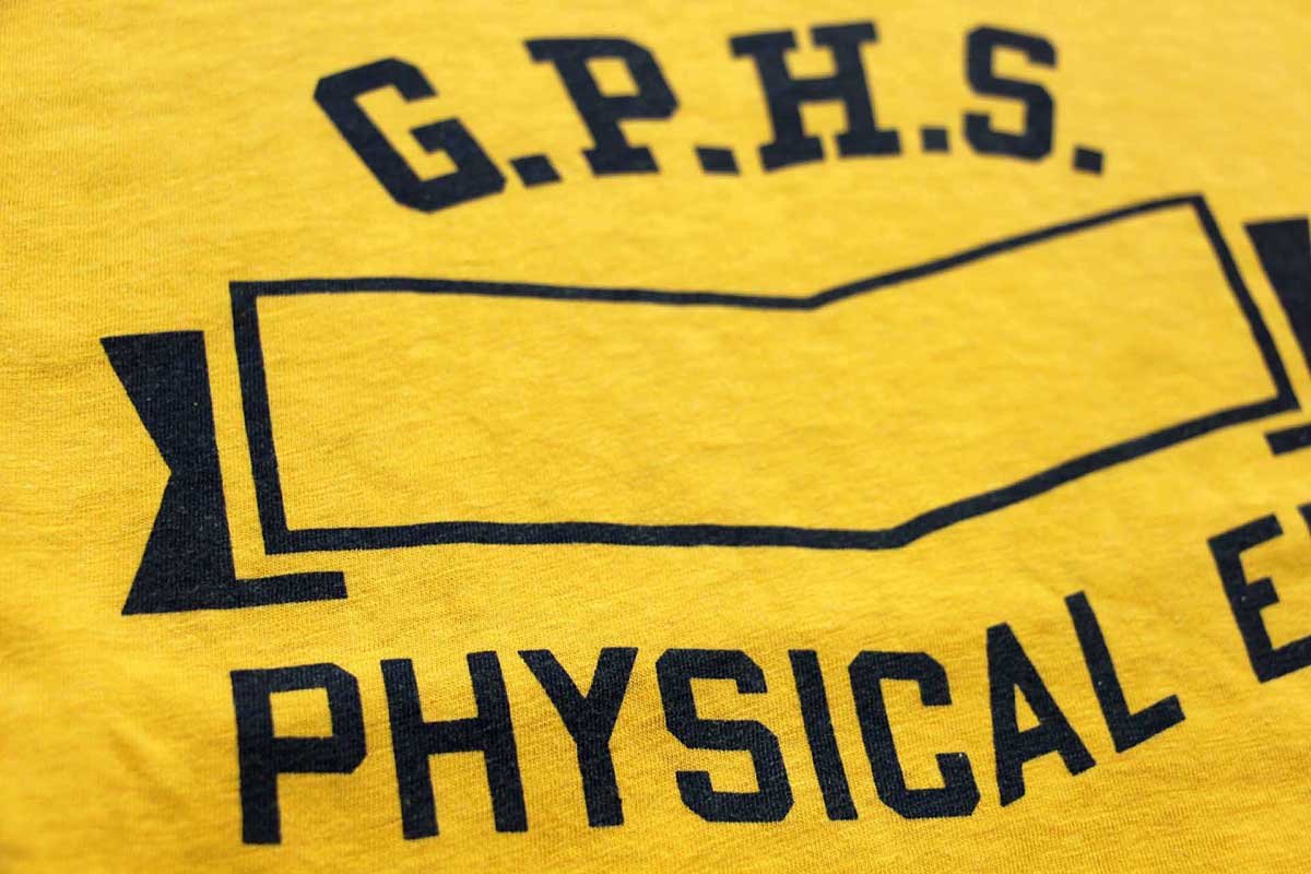 70s USA製 Championチャンピオン G.P.H.S. PHYSICAL ED. 染み込みプリント コットン リバーシブルTシャツ 黄×紺 S