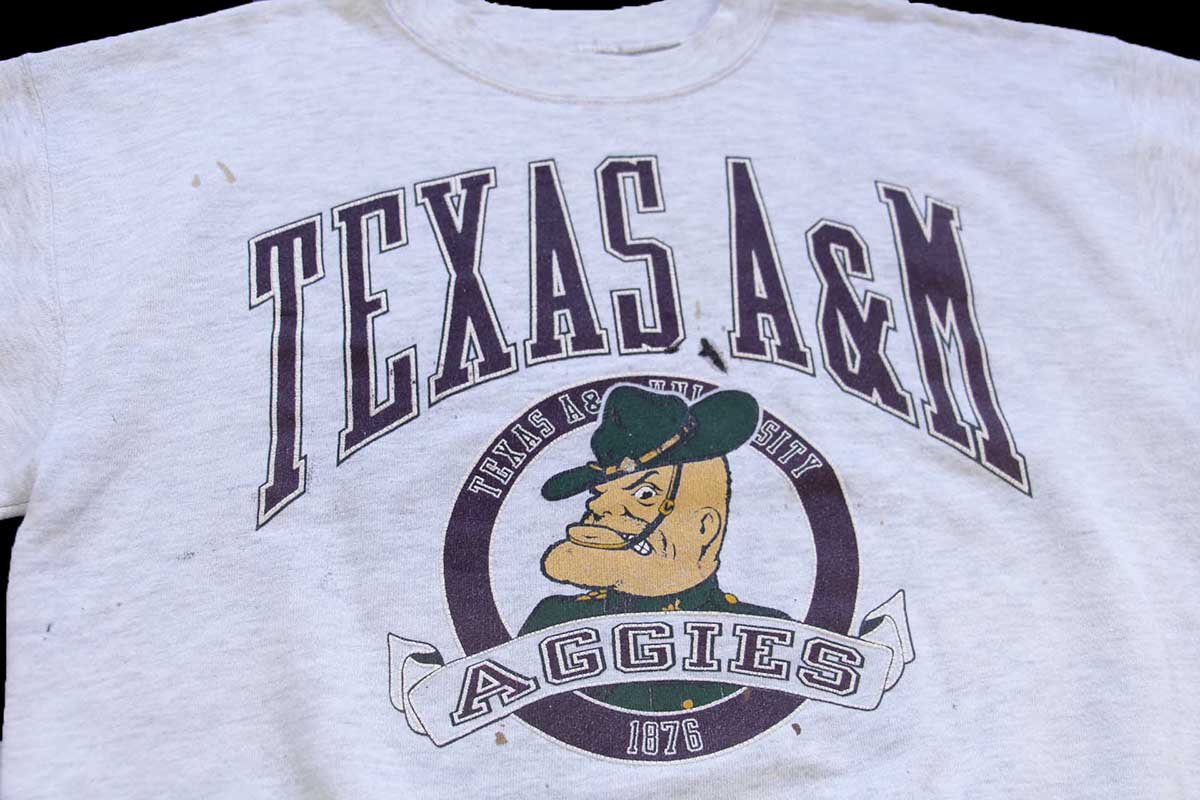 90s USA製 TEXAS A&M AGGIES マスコット ひび割れプリント ペンキ飛び スウェット 杢ライトグレー L