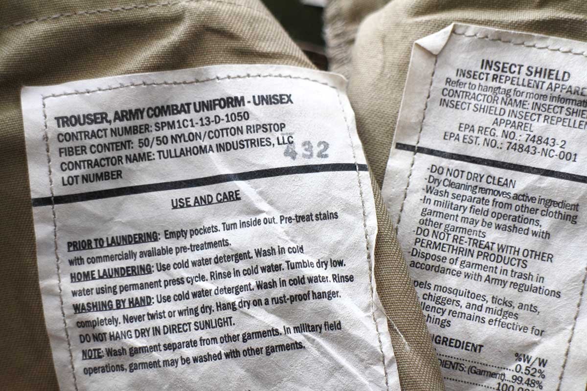 フロントボタンフライ、縫製はダブルステッチ、裾にドローコードあり、防虫性(INSECT REPELLENT APPAREL)表記あり、ヒザとヒップは生地が二重になっています。