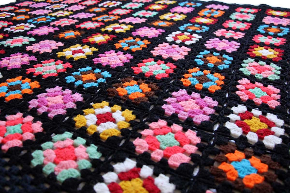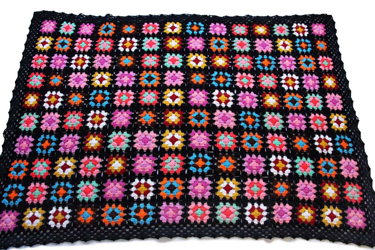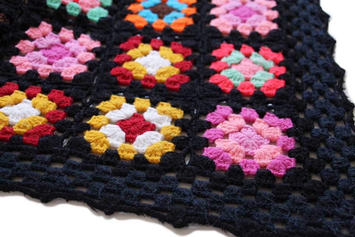 スクエア モチーフ ニット グラニー ブランケット 黒★G カギ編み