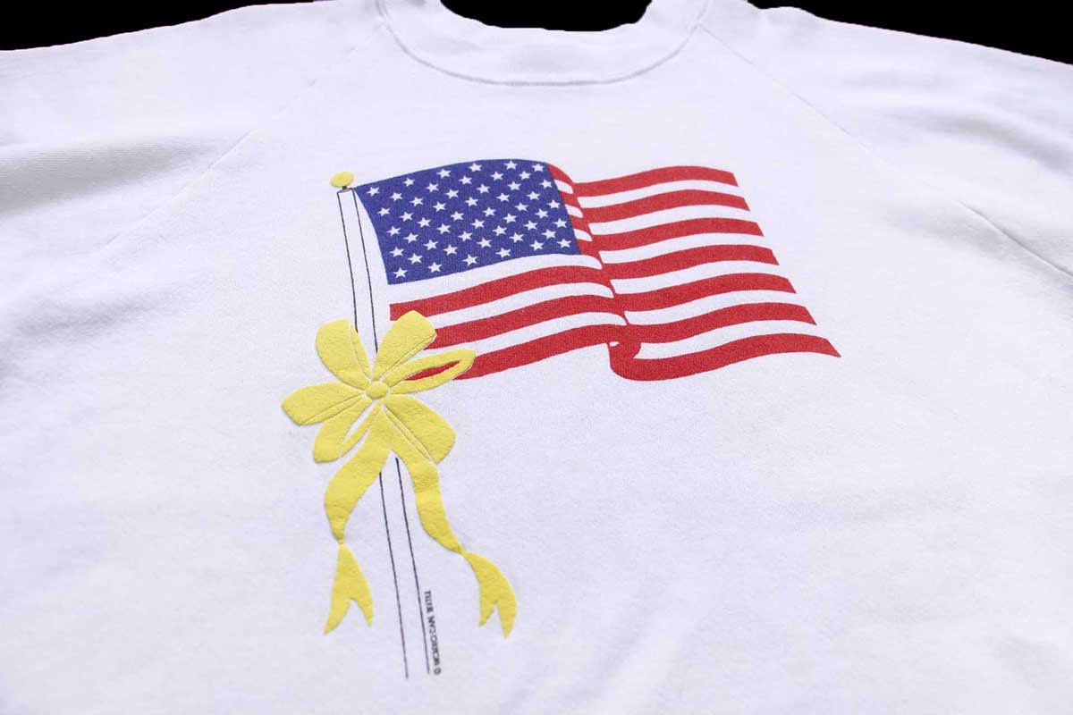 80s USA製 星条旗 リボン 発泡プリント スウェット 白 XL