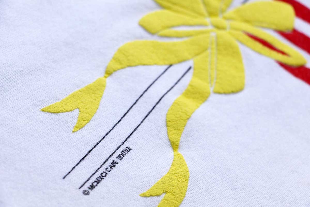 ラグランスリーブ、黄色地は発泡プリント、MCMXCI CAPE TEXTILEのコピーライトあり