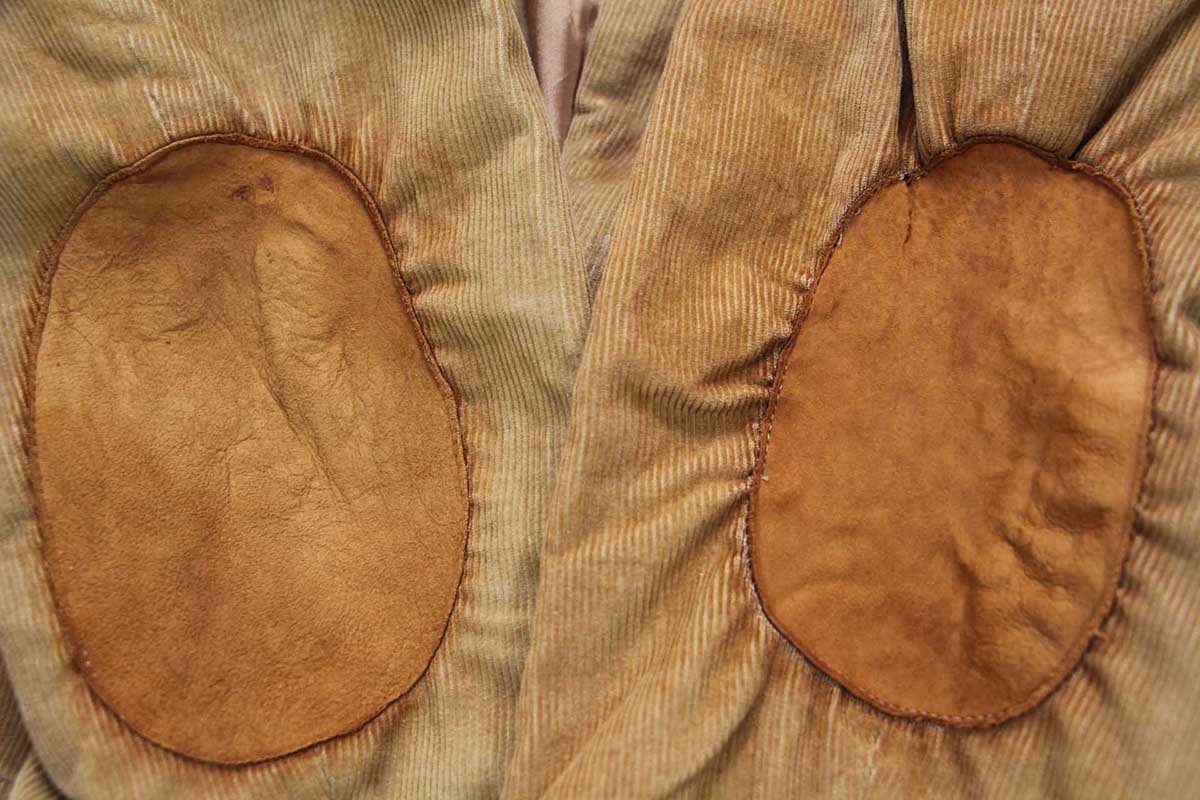 センターベント、両内ポケットあり、裏地あり、レザーのエルボーパッチ付き