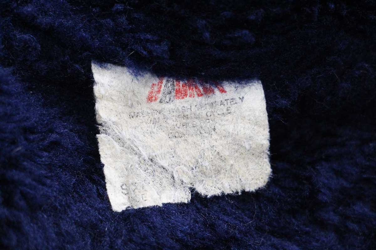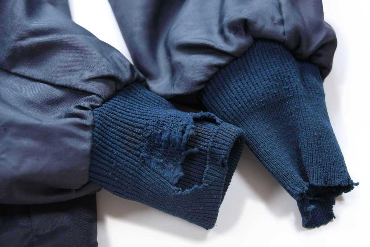 コンディション:着用感があり、所々に汚れや伝線、細かいステッチ飛び、背中上部に火の粉飛び、左ヒジに穴、袖リブに破れがあります。