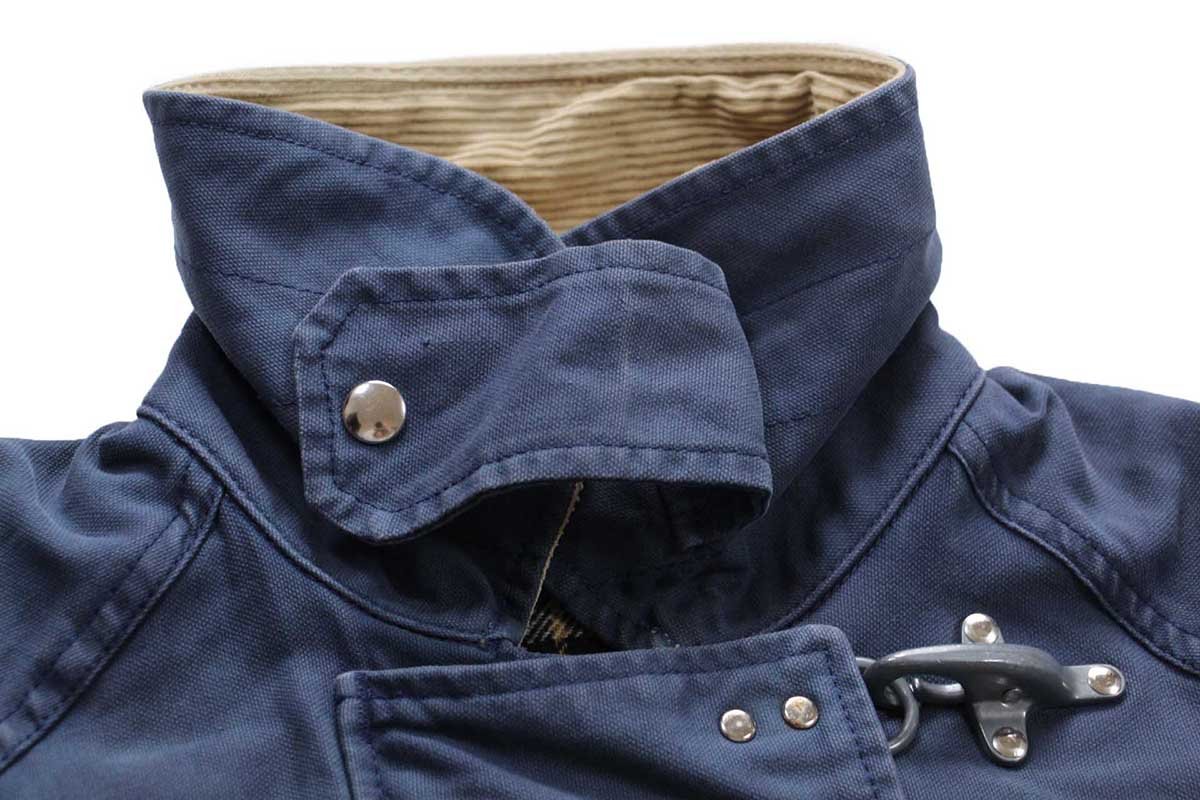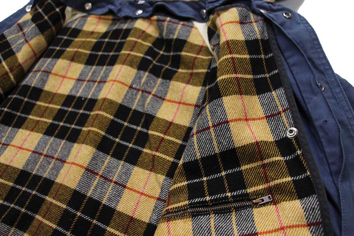 ラグランスリーブ、チンスト付き、フロントはフックとスナップボタン、襟は太畝コーデュロイ、袖口のパイピングはスエードレザー、袖口内にリブあり、左内ポケットあり、薄中綿入りのタータンチェックライナーはスナップボタンで取り外し可能です。