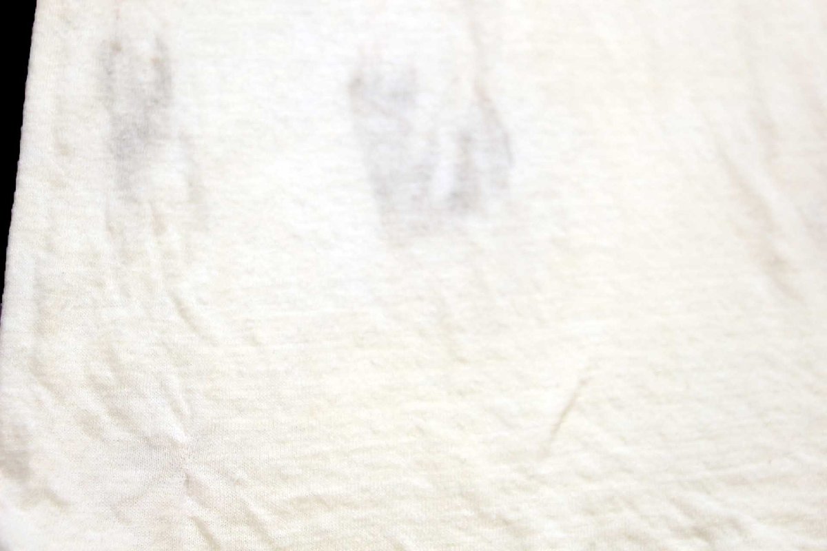 コンディション:着用感があり、フロント下部に多少の汚れ、ネックにピンホール、左胸とフロント右裾に細かいリペアがあります。
