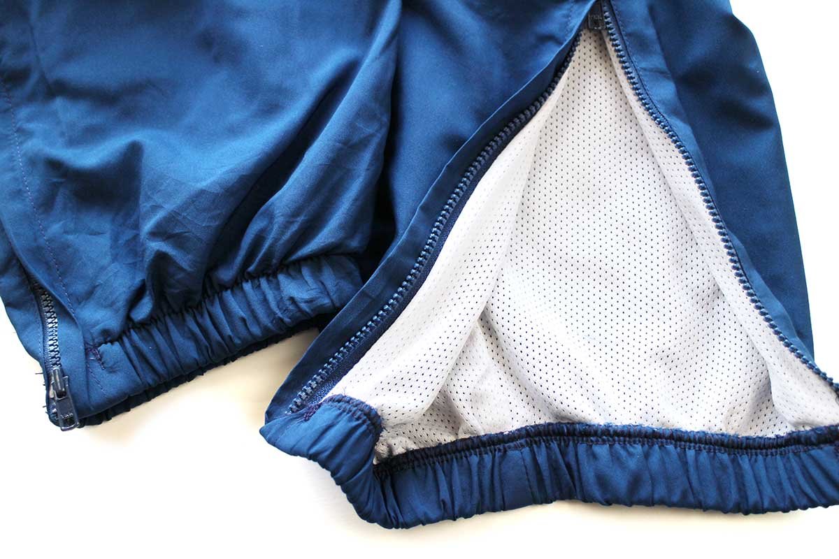 ウエストにゴム&ドローコードあり、サイドポケットあり、右ポケット内にネームタグあり、裾にジップあり、ヒザ下にリフレクターテープあり、裏地はメッシュ