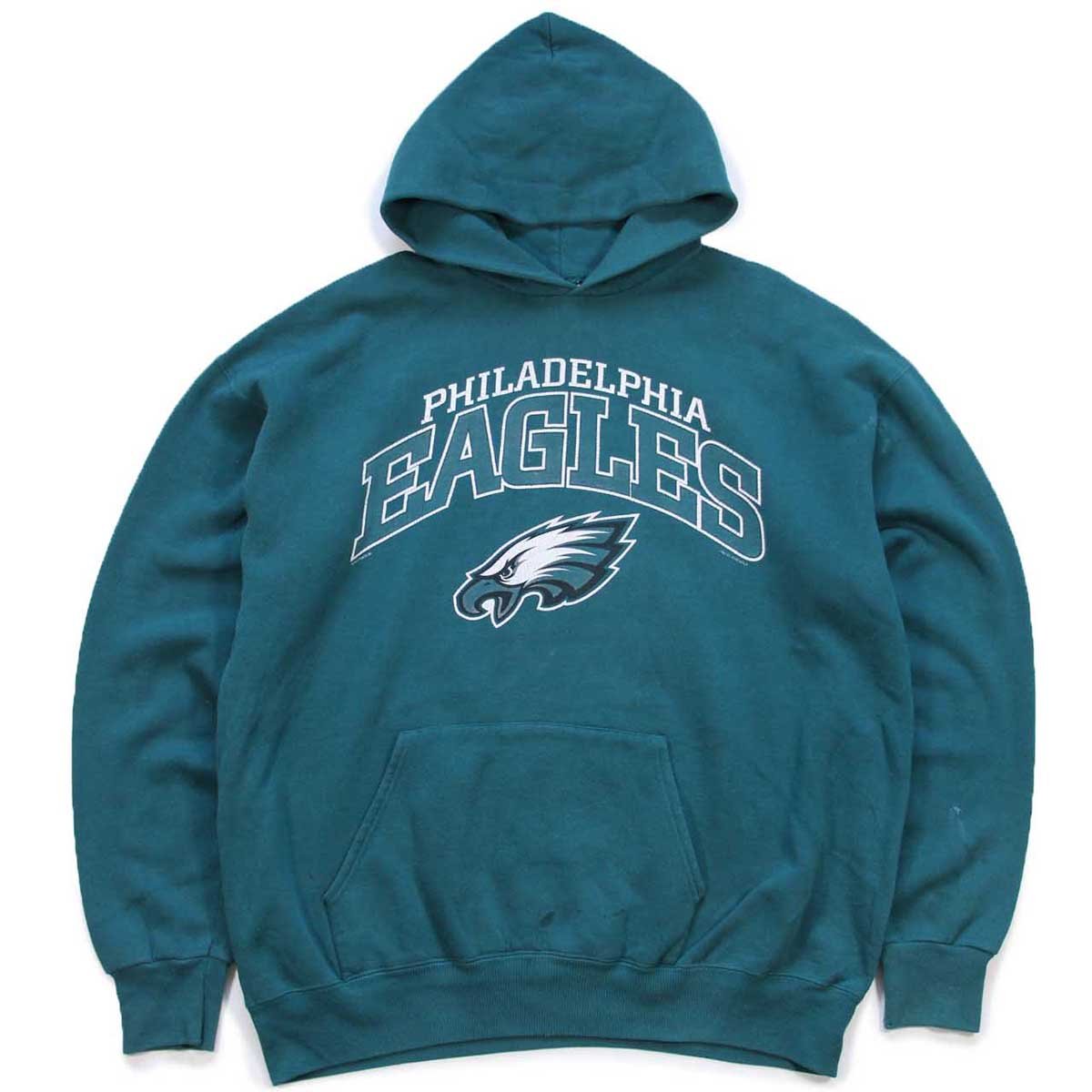 90s USA製 Leeリー NFL PHILADELPHIA EAGLES ひび割れプリント スウェットパーカー 青緑 L★フーディー