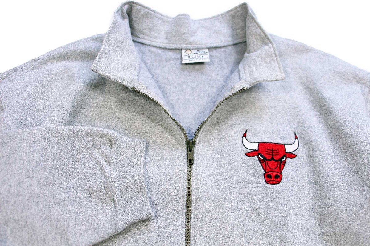 90s USA製 The Cotton Exchange NBA CHICAGO BULLS シカゴ ブルズ 刺繍 スタンドカラー ハーフジップ スウェット 杢グレー XL