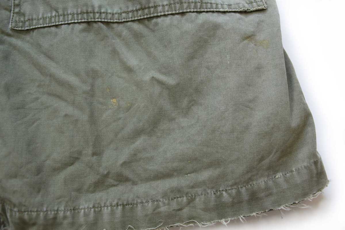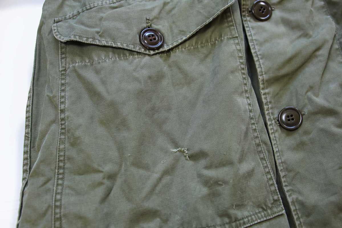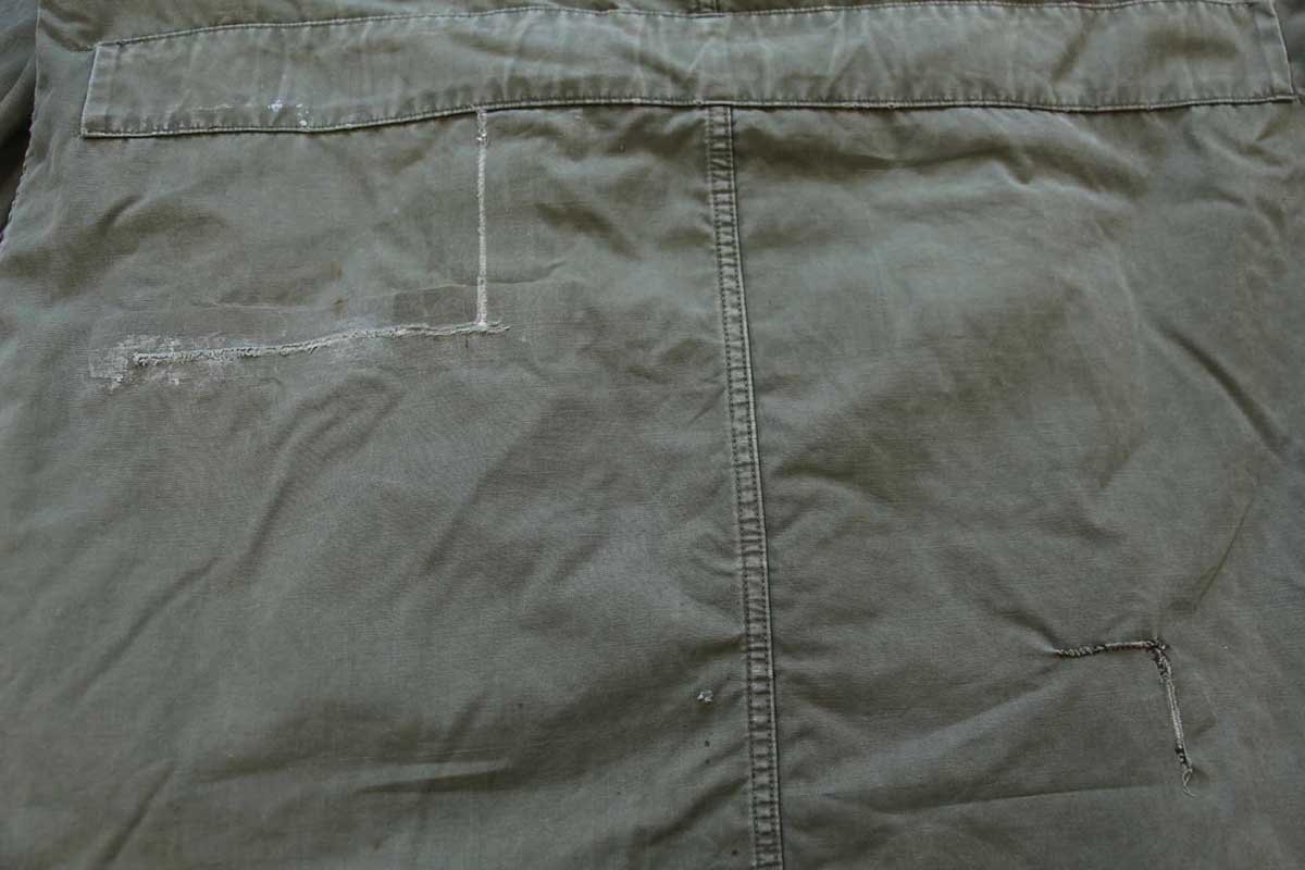 コンディション:着用感があり、所々に薄汚れや細かい擦れ、ステッチ飛び、左袖にペンキ汚れ、袖口と裾に擦り切れ、フロント右下ポケットに1cm×1cmと背中右下部に4cm×4.5cmのカギ型のリペア、背中左腰付近に15cm×10cm程のリペア(裏から当て生地)、フロントジップ差し込みの付け根にリペアがあります。