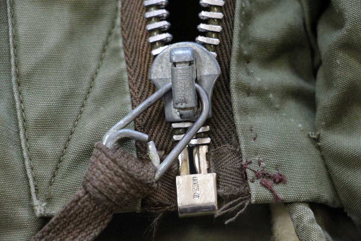 フロントCONMARアルミジップ、フードにドローコードあり、腹部ポケット内はウール 、縫製はダブルステッチ、ウェブベルトは欠損しています。