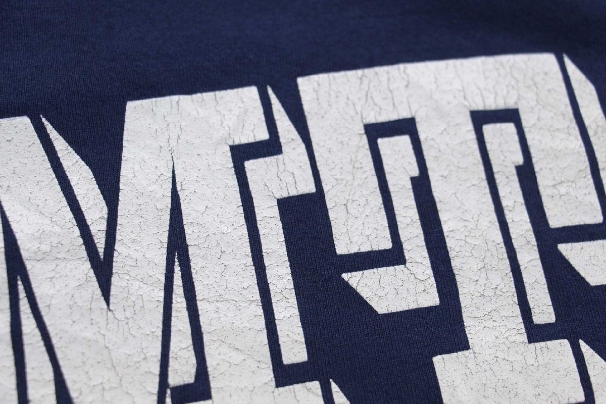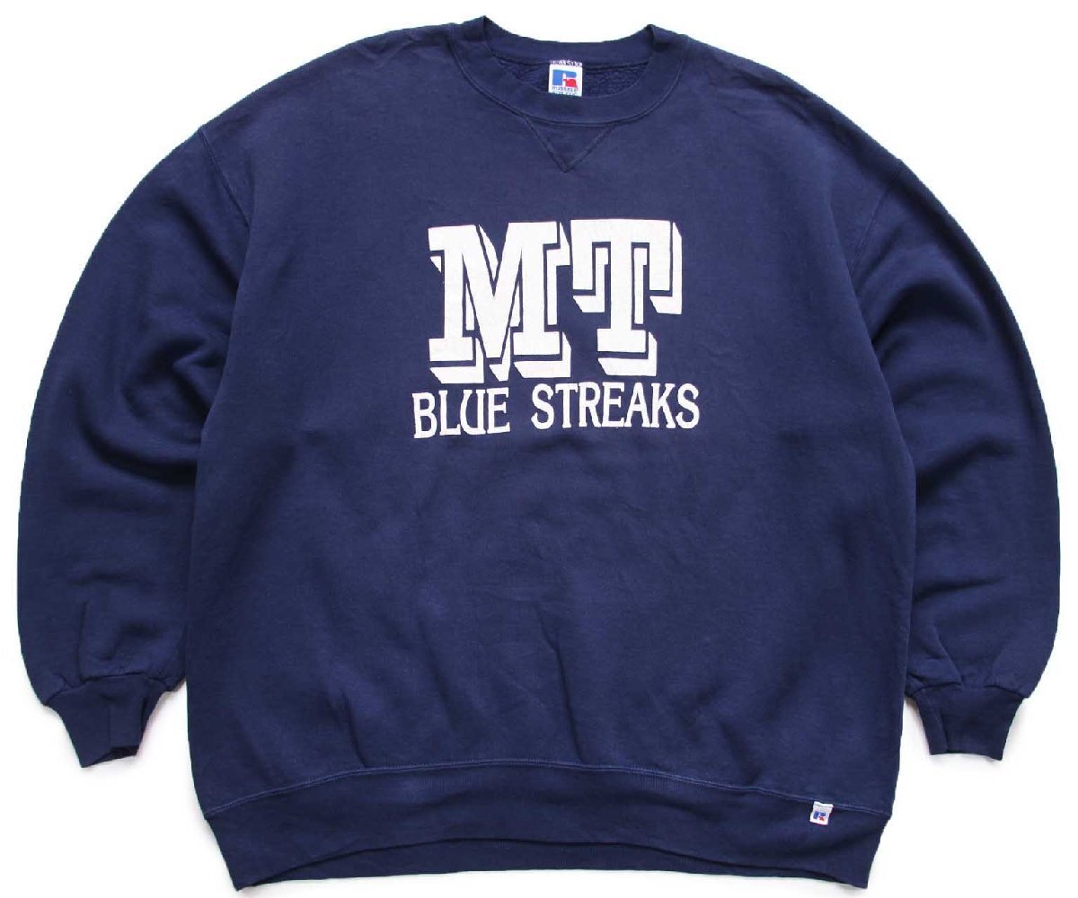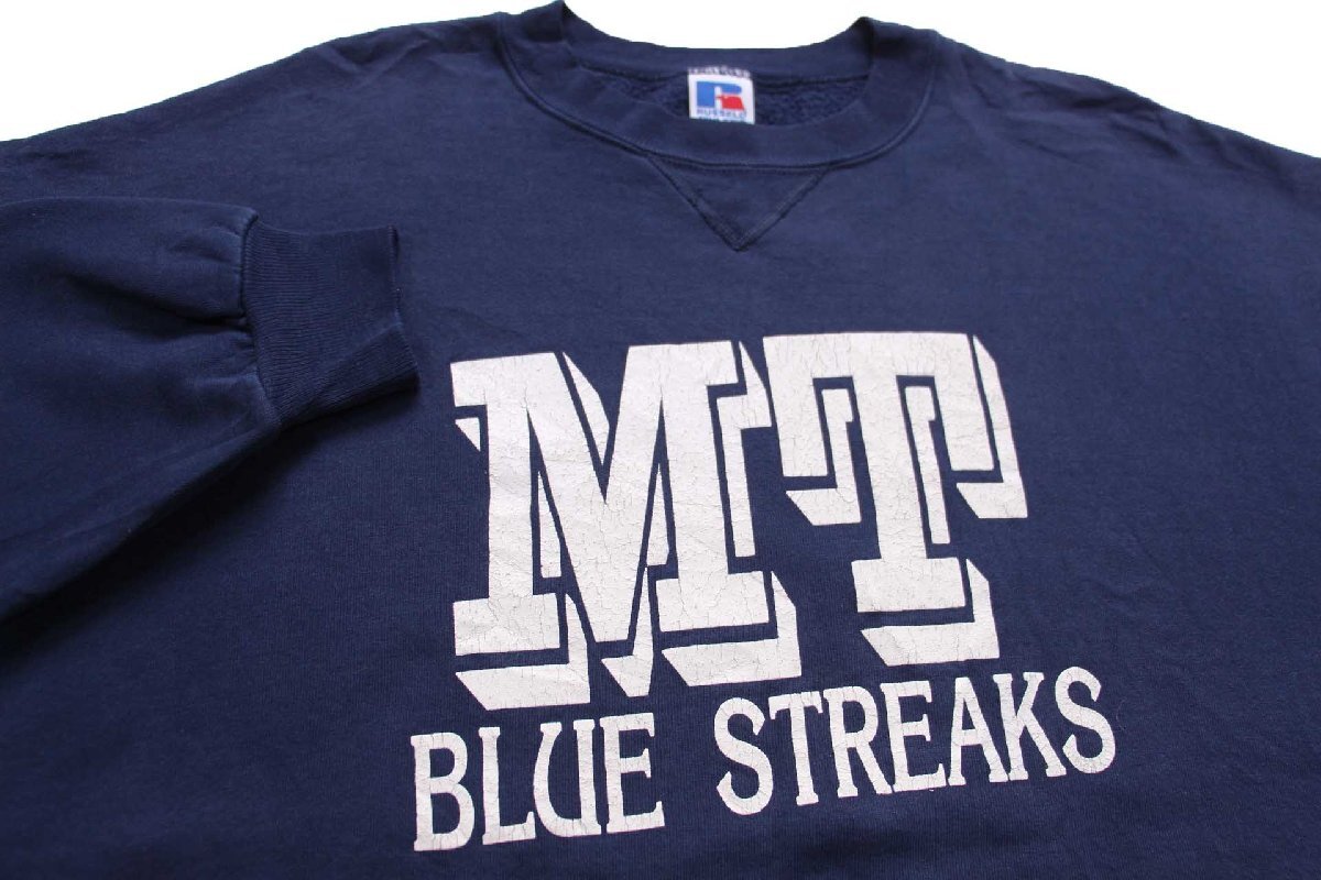 90s USA製 RUSSELLラッセル MT BLUE STREAKS ひび割れプリント 前V スウェット 紺 XXL★特大