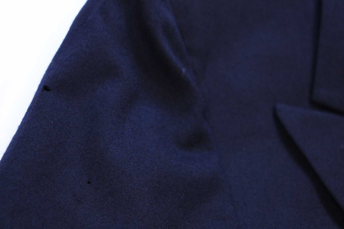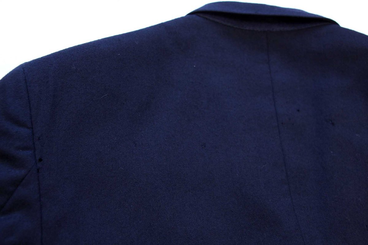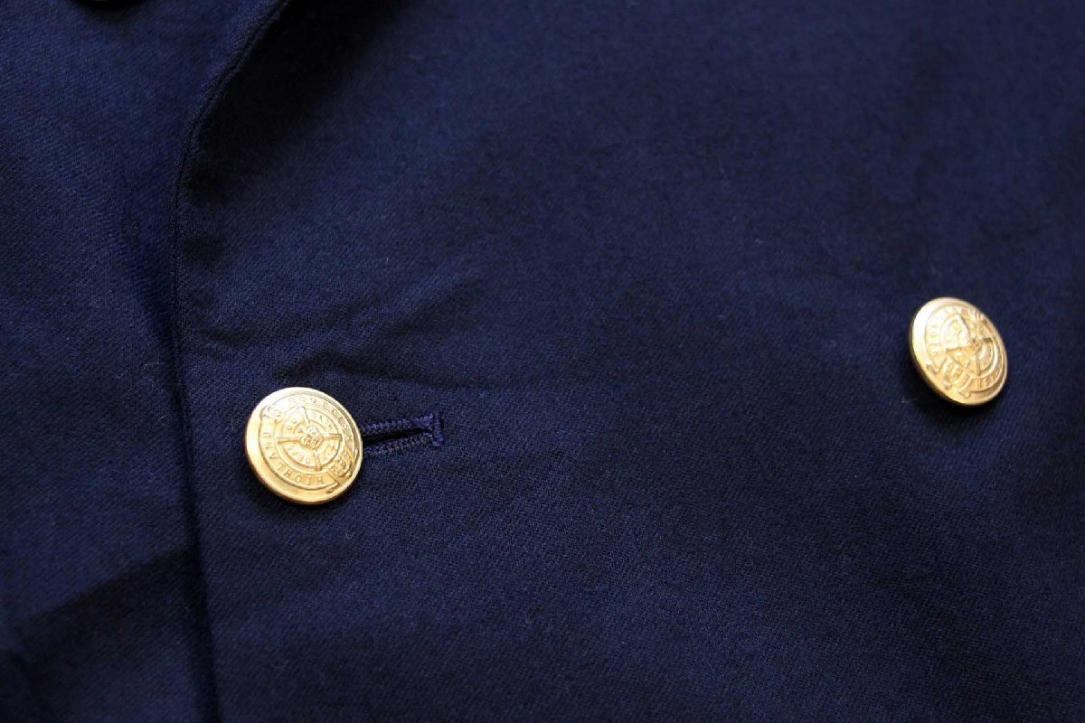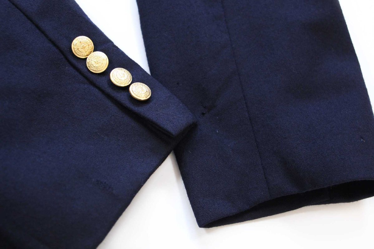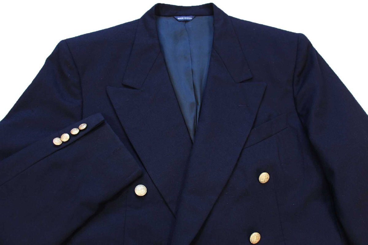 ダブルブレスト、ノーベンツ、金ボタン、左右内ポケットあり、肩パッドあり、裏地あり、胸と腹部のポケットはステッチでふさがっています。
