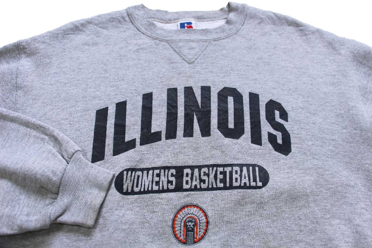 90s USA製 RUSSELLラッセル ILLINOIS WOMENS BASKETBALL インディアンヘッド ロゴ 前V スウェット 杢グレー L