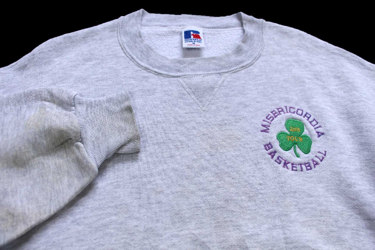 90s USA製 RUSSELLラッセル MISERICORDIA BASKETBALL クローバー 刺繍 前V スウェット 杢ライトグレー M