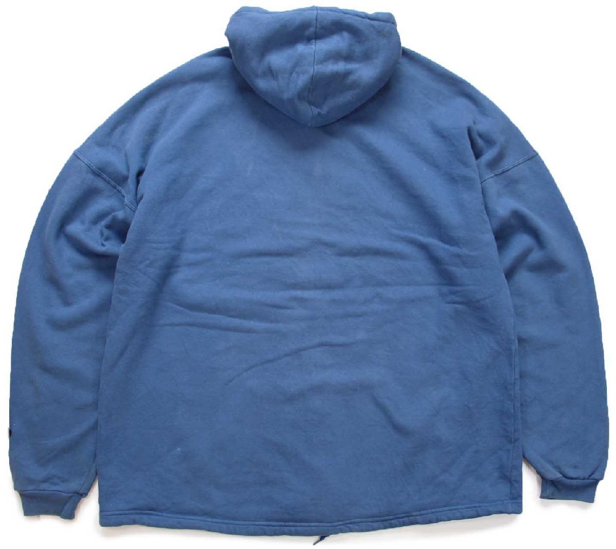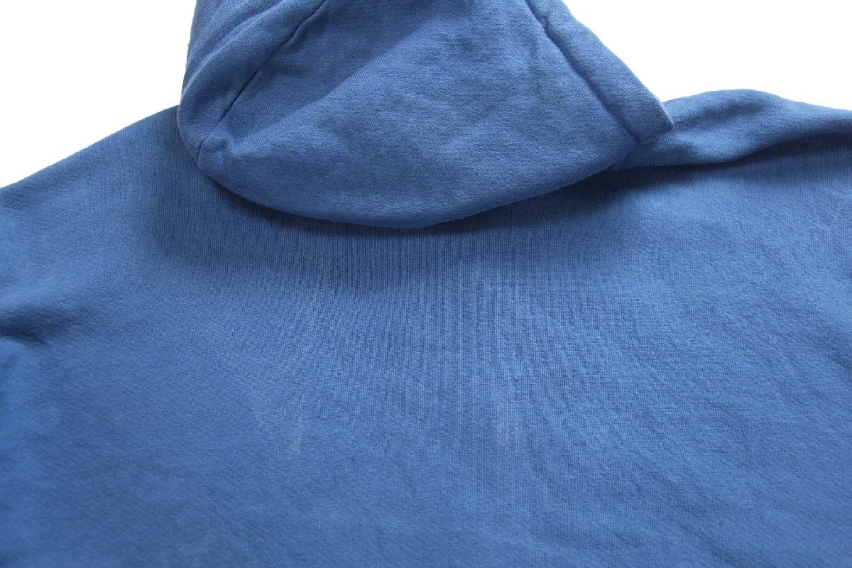 コンディション:着用感があり、背中上部にうっすら色落ち、襟ぐりやフード、袖先に多少の薄汚れがあります。目立つダメージや酷い汚れはなく、生地もしっかりしていて、古着慣れされている方なら問題なく着用いただける程度です。