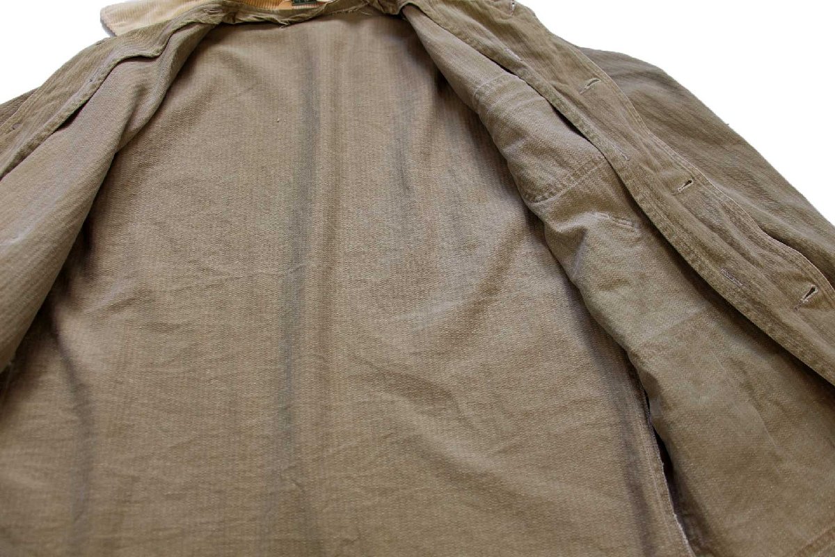 襟や袖口裏、ポケット口裏は太畝コーデュロイ、縫製はダブルステッチ、脇にベンチレーションホールあり、背中にアクションプリーツあり、ライナーをつける為のボタンホールあり(ライナーは付いていません)、肩は生地が二重になっています。