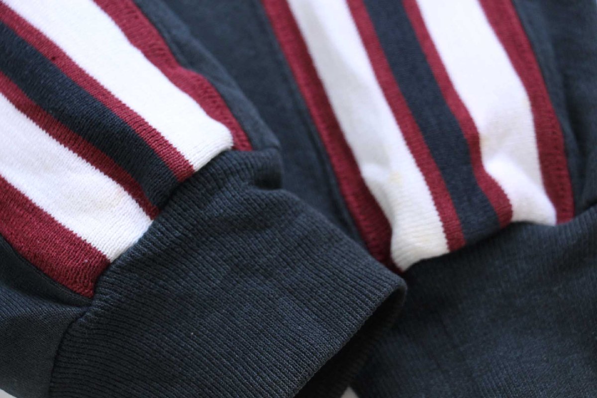 コンディション:着用感があり、右ヒジに少しの色抜け、フロント中央にうっすら汚れ、袖の白地に多少の色にじみと薄汚れがあります。目立つダメージや酷い汚れはなく、生地もしっかりしていて、古着慣れされている方なら問題なく着用いただける程度です。