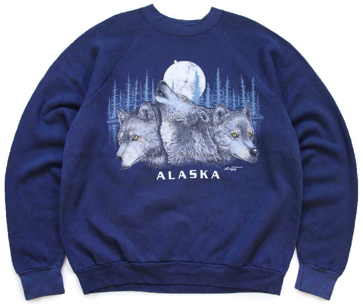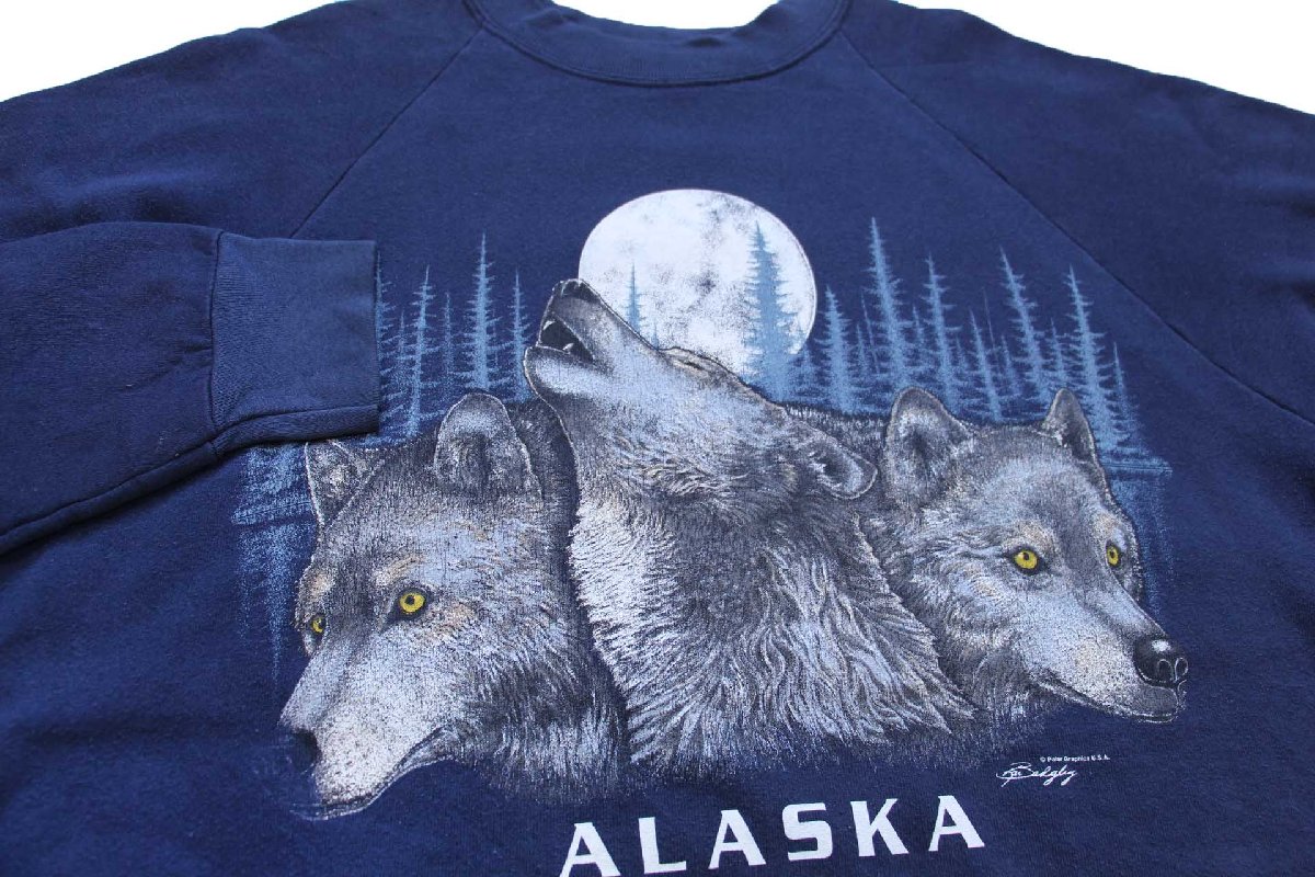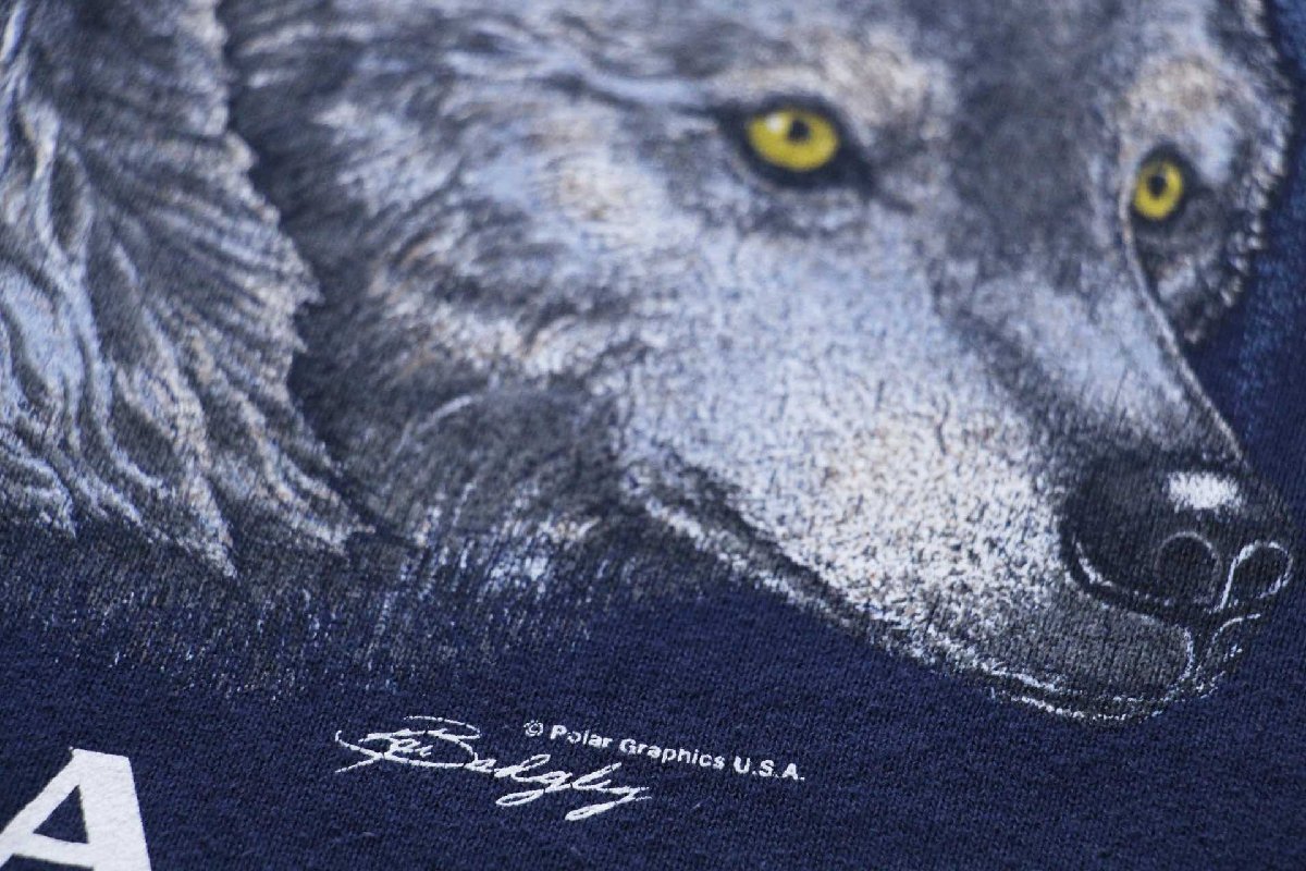 90s USA製 ALASKA ウルフ アート スウェット 紺 XXL★特大
