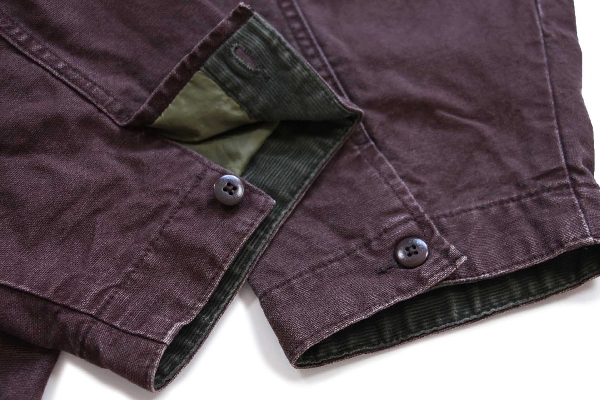 襟や袖口裏、ポケット口裏はコーデュロイ、ダブルステッチ襟、縫製はダブルステッチ、チェックのコットンライナー、背中にアクションプリーツあり、肩は生地が二重になっています。