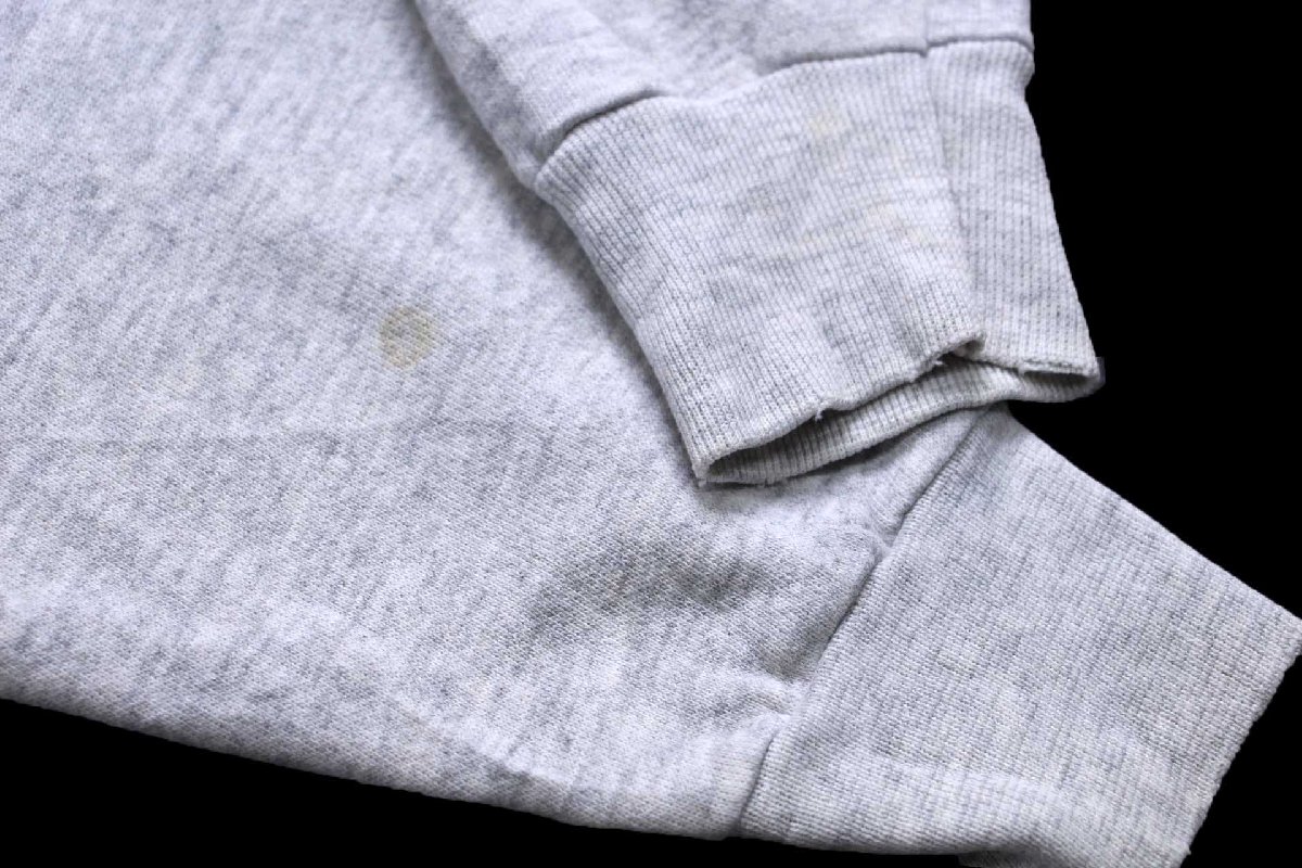 コンディション:着用感があり、脇や袖、腹部に汚れ、ネックと袖リブに細かい生地の開き、右胸に1つの穴があります。