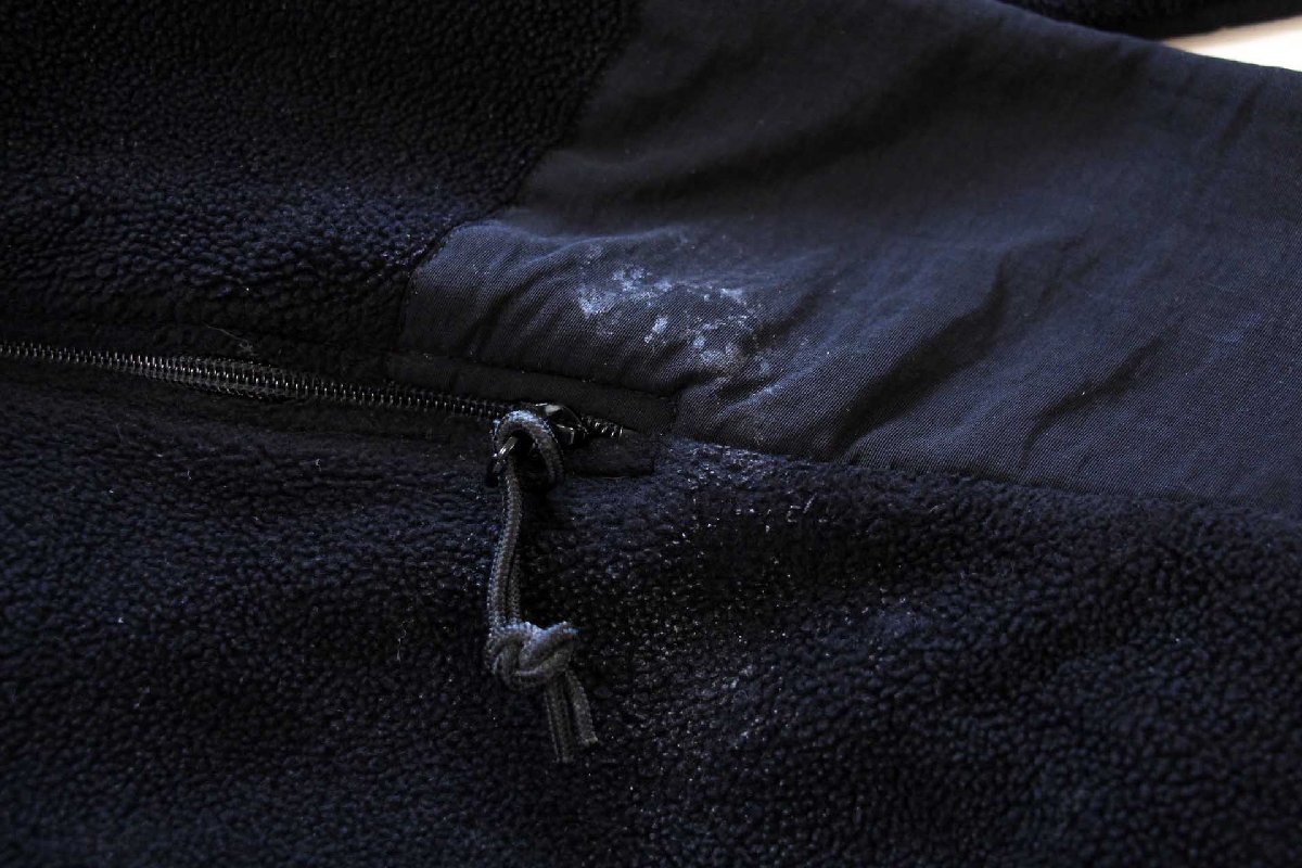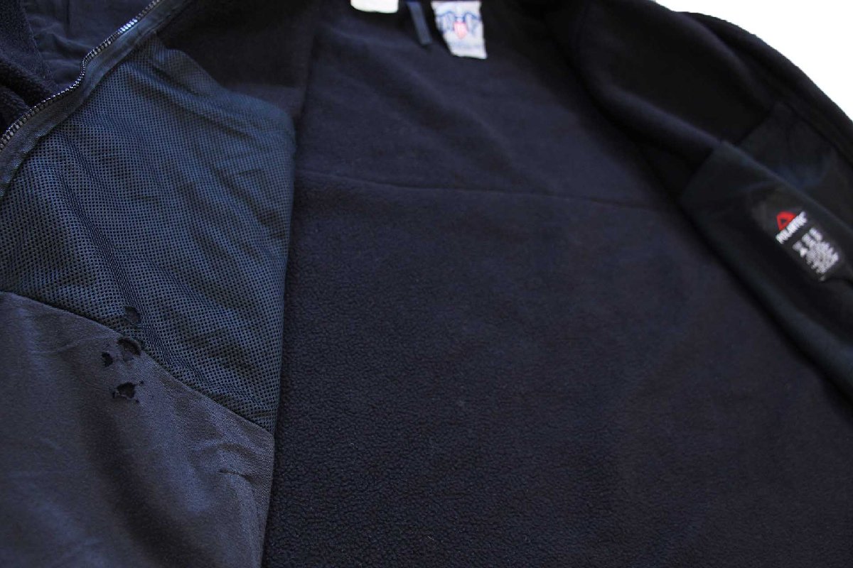 コンディション:着用感があり、右袖や右脇下、背中右下部に少しのボンドのような薄汚れと若干のフリースの薄れ、背中右サイド裾に少しの剥げと2つの細かい小穴、フロント右裏地に細かい破れがあります。目立つダメージや酷い汚れはなく、古着慣れされている方なら問題なく着用いただける程度です。
