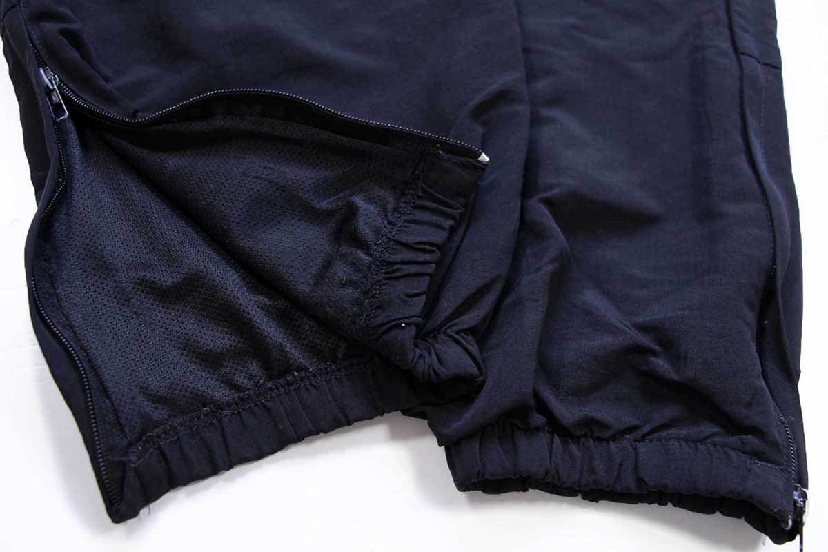 ウエストにゴム&ドローコードあり、サイドポケットあり、裾にジップあり、右ポケット内にネームタグあり、裏地はメッシュ、ヒザとヒップは生地が二重になっています。