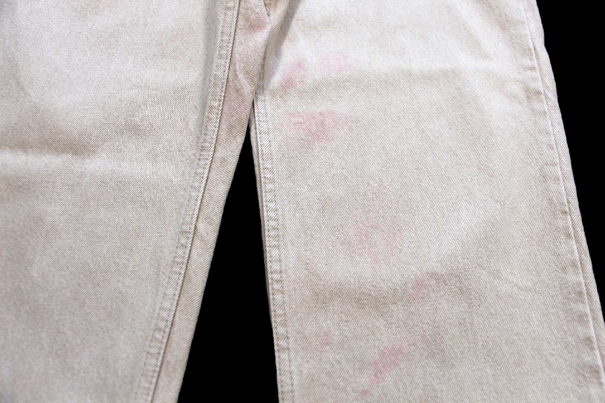 コンディション:着用感があり、所々に若干の赤い色移りがあります。目立つダメージはなく、生地もしっかりしていて、古着慣れされている方なら問題なく着用いただける程度です。