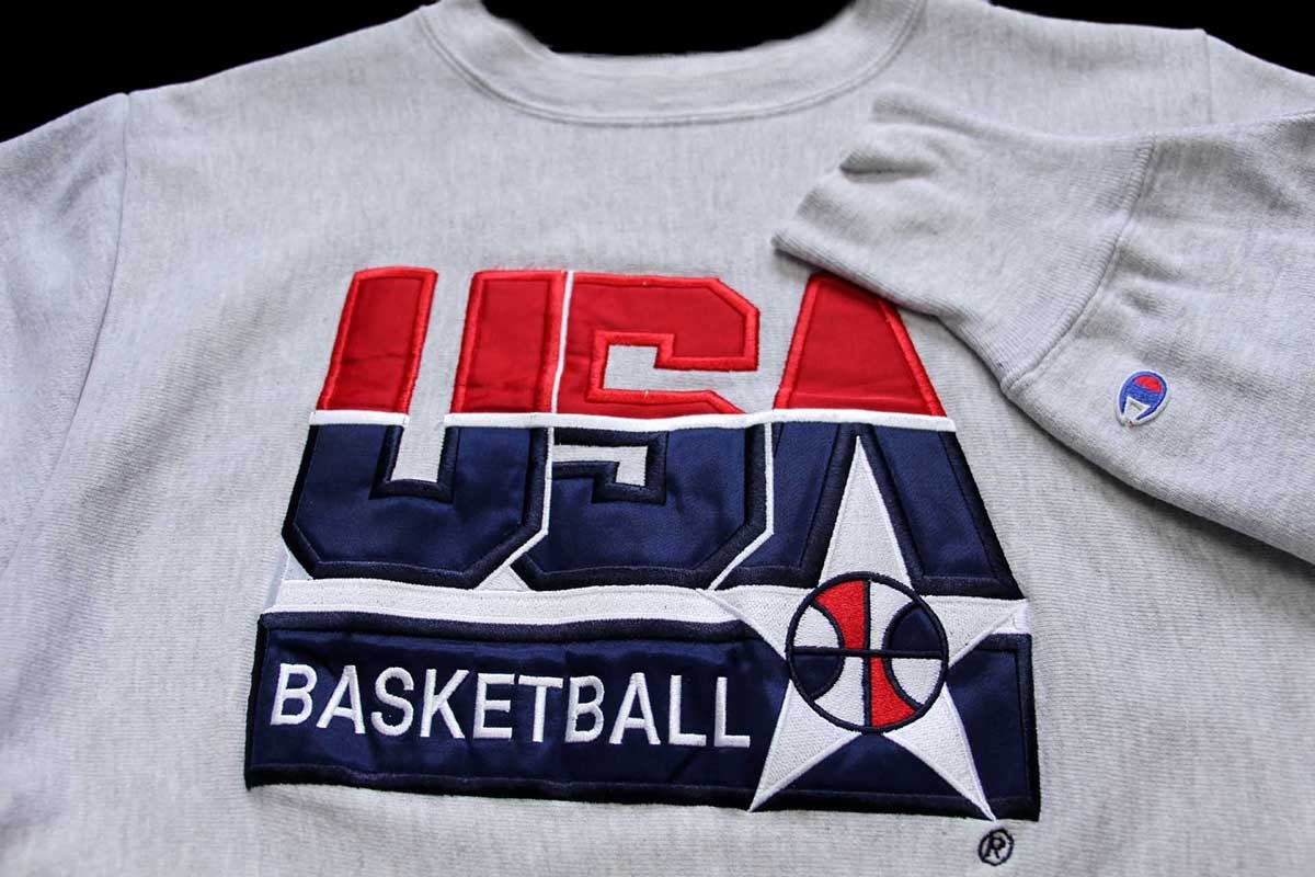 リサイズ★90s USA製 Championチャンピオン USA BASKETBALL アップリケ&刺繍 リバースウィーブ スウェット 杢グレー