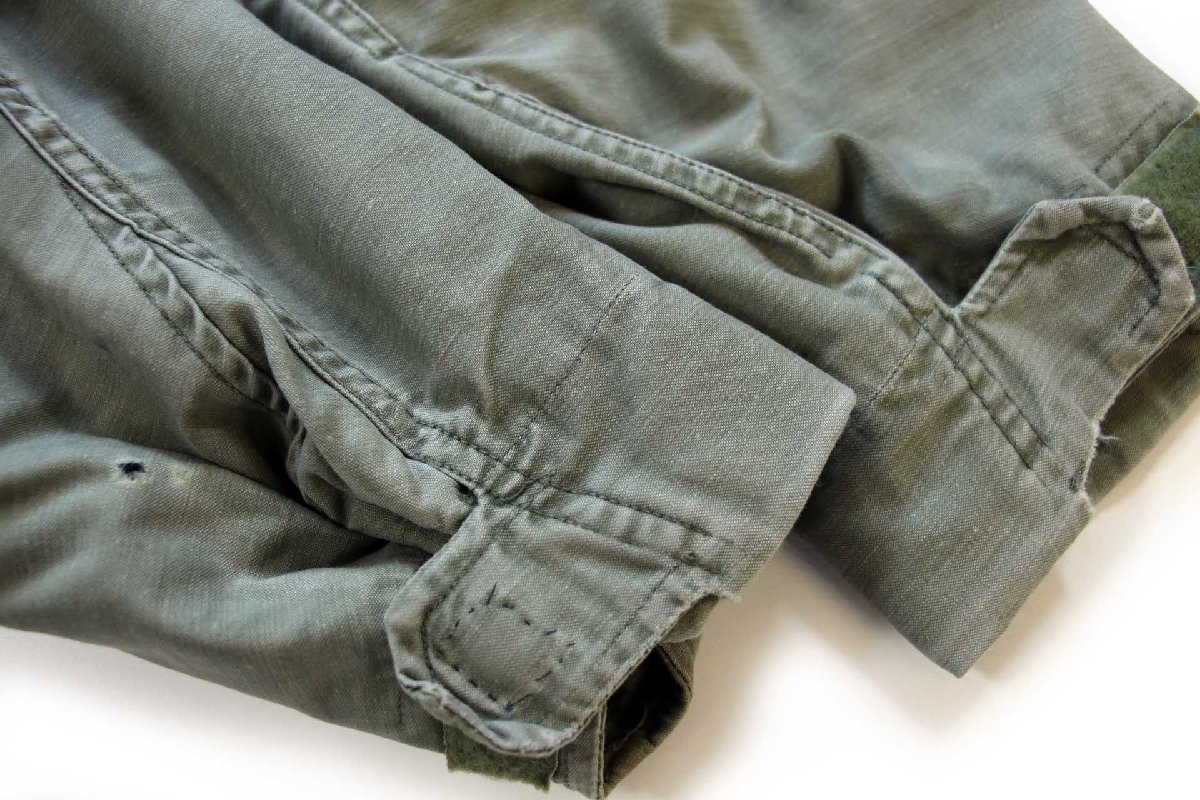 コンディション:着用感があり、全体的に色落ち、所々に少しの細かい薄汚れ、右袖先に1つの小穴、右袖口ベルクロや裾裏にリペア、裏地の襟付け根と裏地裾に擦り切れがあります。致命的なダメージや酷い汚れはなく、味とご理解いただける方でしたら問題なく着用いただける程度です。