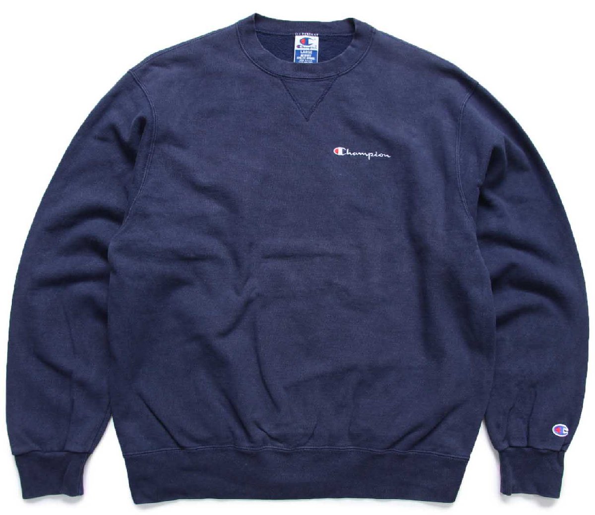 90s USA製 Championチャンピオン ワンポイント スクリプト ロゴ刺繍 前V スウェット 紺 フェード L