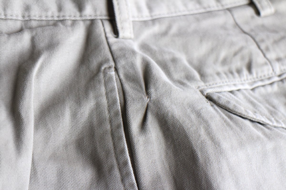ツータック、フロントジップフライ(YKK)、ヒップポケットは両玉縁、裾はダブル