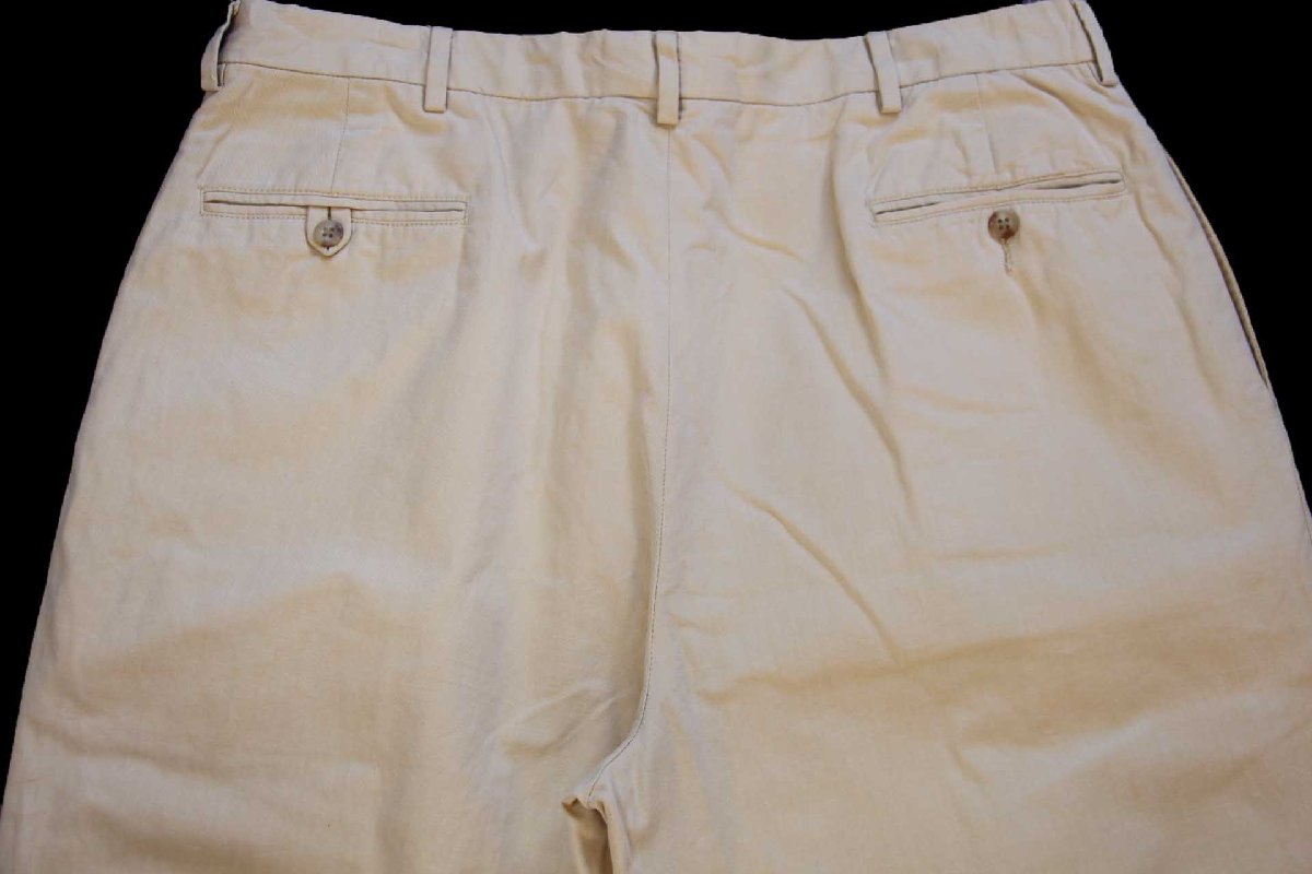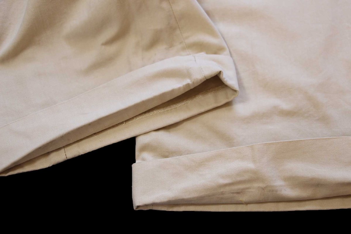ツータック、フロントジップフライ(YKK)、ヒップポケットは両玉縁、裾はダブル