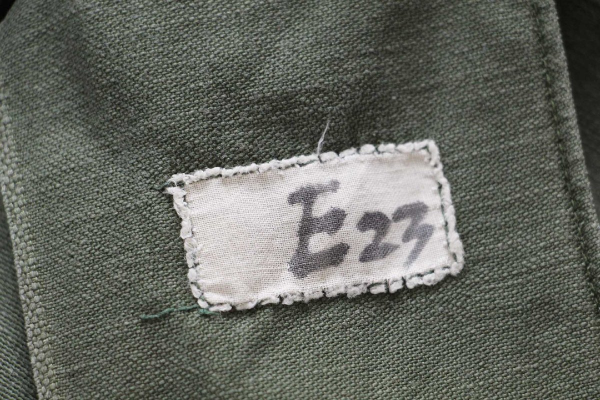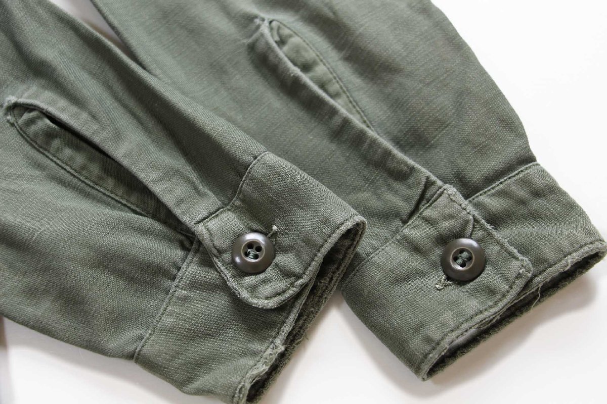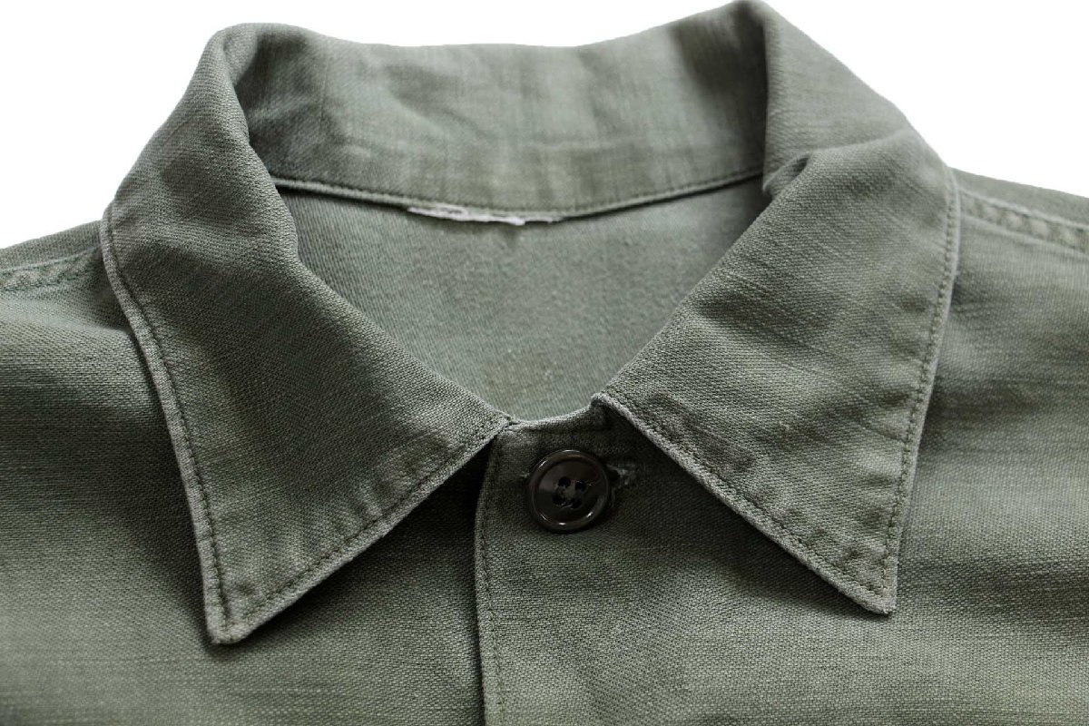 コンディション:着用感があり、全体的に色落ち、背中襟下に僅かな薄汚れ、右胸ポケットにリペア(縫い直し)やパッチの剥がし跡、袖口に多少の擦れ、トップボタンが交換されています。目立つダメージや酷い汚れはなく、生地もしっかりしていて、古着慣れされている方なら問題なく着用いただける程度です。